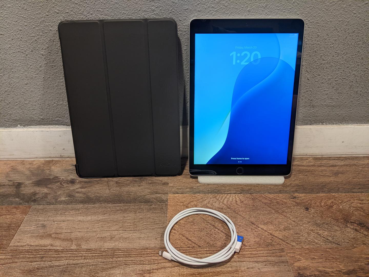 This iPad is in very good condition, showing minor wear. There is an existing glass screen protector installed, which has some bubbles/dust under it.