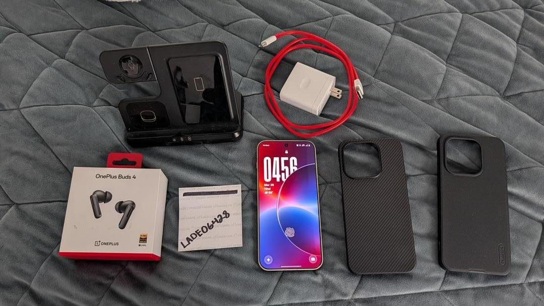 This is like new, battery is still at 100%. Glass screen protector on it since day 1. Comes with new openbox OnePlus Buds 4 headphones with silicone case. They are open but are actually never used. Also comes with a carbon fiber case plus another extra case. Comes with a wireless 3-in-1 charger. Also comes with the original charger and cable.