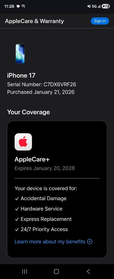 AppleCare+: Covered through January 2028, providing extensive protection against accidental damage and hardware issues.