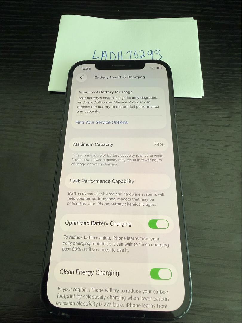 This iPhone 12 comes in the midnight color with 256GB of storage and is compatible with AT&T with no SIM restrictions, ready to activate. The device is in fair condition with 79% battery health and all functions working exactly as they should. All parts are OEM, and the phone has been tested to ensure full functionality.