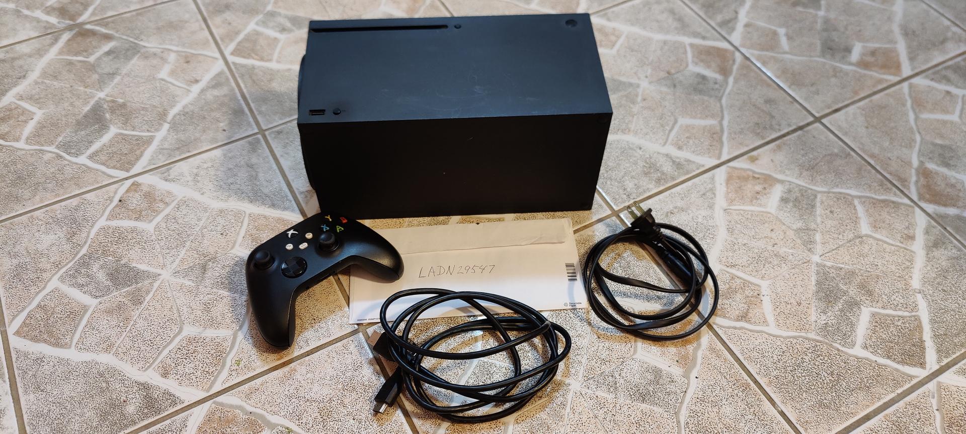 Xbox Series X with controller and cables (power and HDMI.)