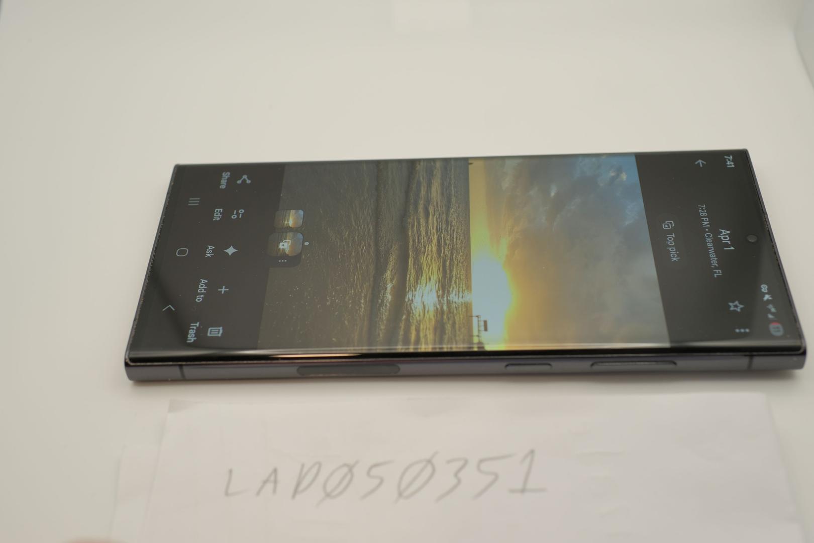 The device is in great condition but has two minor cosmetic flaws: 1) A small, shallow dent on the top of the phone corner of the metal frame. 2) Light surface scratches on the screen that are only visible when the display is off under direct light. These scratches cannot be felt with a fingernail and are completely invisible during use. The rear glass, camera lenses, and S-Pen are all in pristine condition. 100% fully functional with no issues.