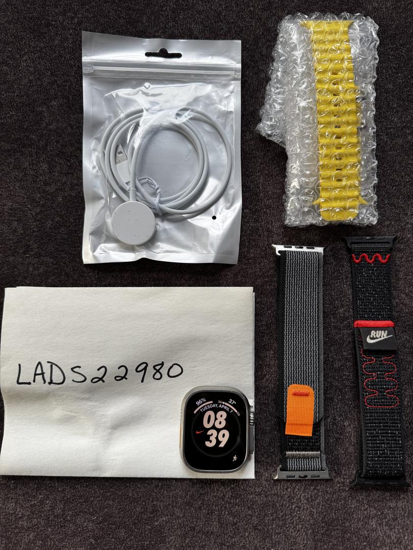 Apple Watch Ultra with 100% battery health. Watch is flawless. Watch includes Nike sport loop band, Trail loop band and Ocean band. Also includes new aftermarket charger.