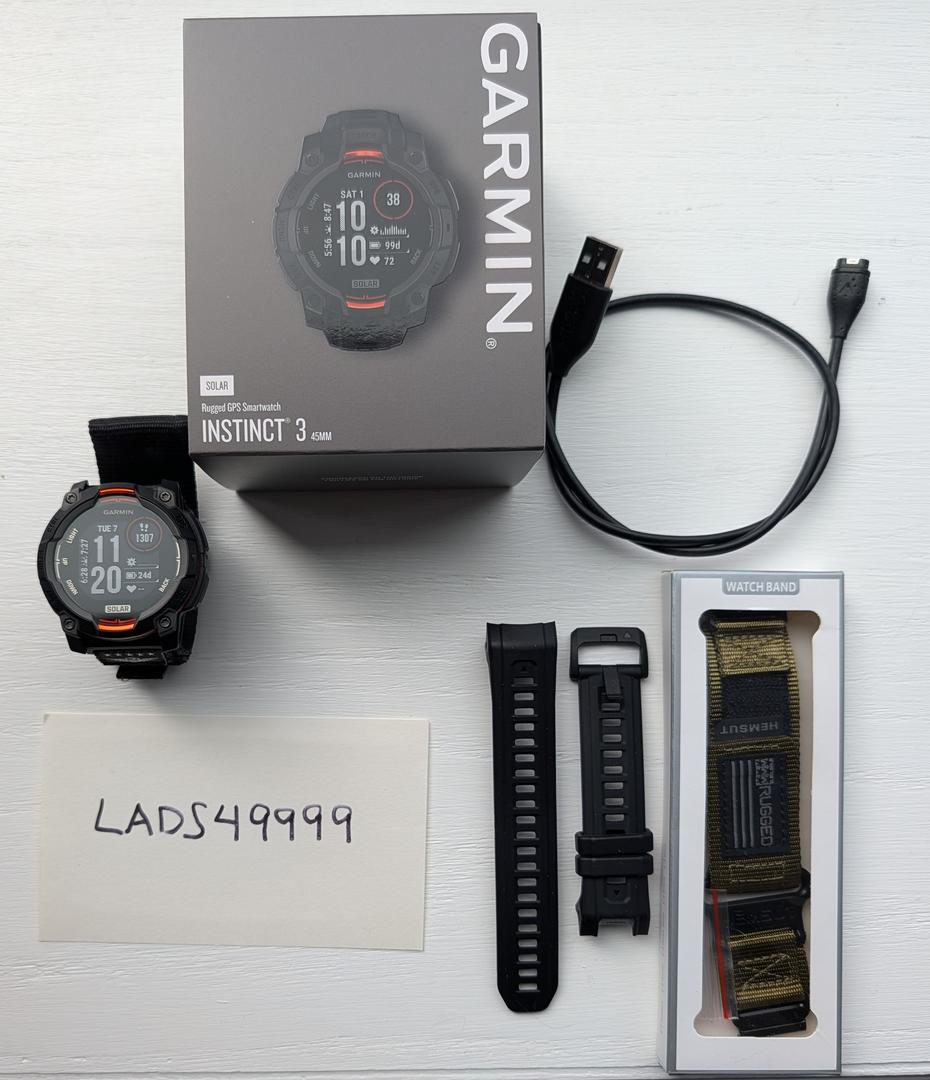 Mint Garmin Instinct 3 Solar with original band, charging cable, and packaging. Includes two extra Velcro bands.