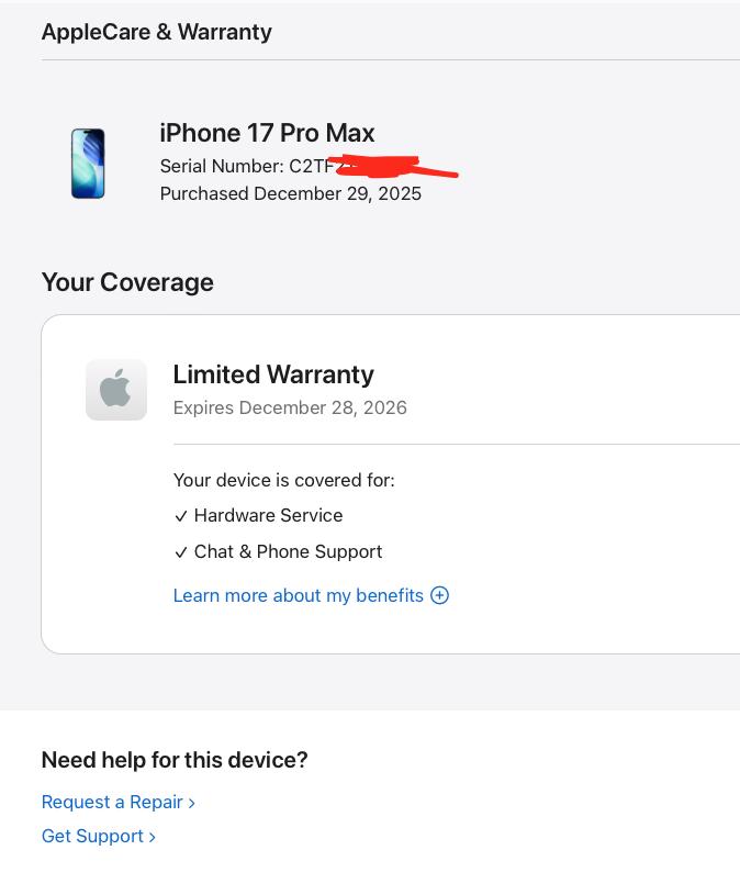 APPLE WARRANTY TILL 12/28/2026