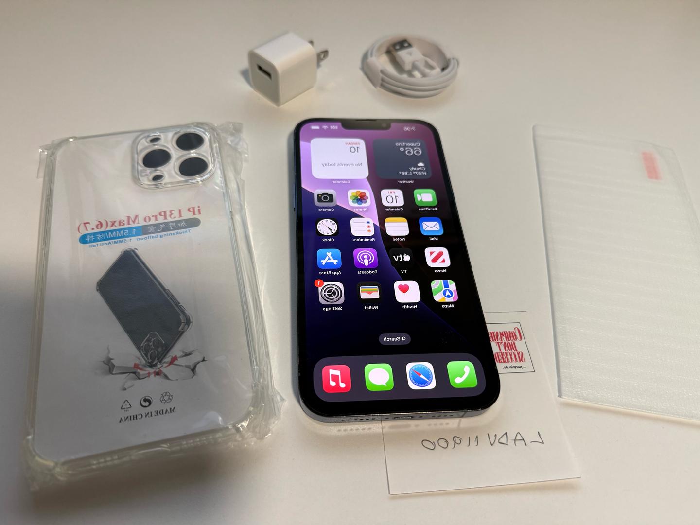 Please note: this iPhone 13 Pro Max does not come with its box and accessories. It comes with a complimentary new usb cable, new changer, new tampered screen protector, and a new clear case. Please see images for details.