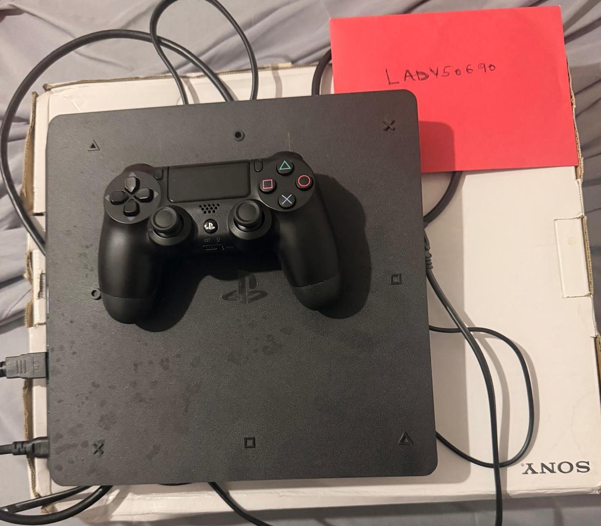 PS4 Slim 500GB in good working condition. Includes controller, HDMI cable, and power cable. Factory reset and ready for a new owner.