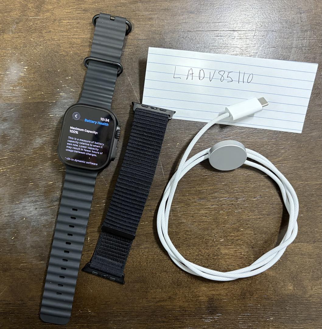 Black unlocked Apple Watch Ultra 2 in pristine condition with 100% battery health. The watch is fully updated to the latest software and supports latest health tracking features, including sleep score and hypertension notifications. Included are the watch itself, a black aftermarket nylon band (from Amazon), and the charging cable. Please note that the original box is not included. The device factory reset, and is completely ready for a new user to pair.