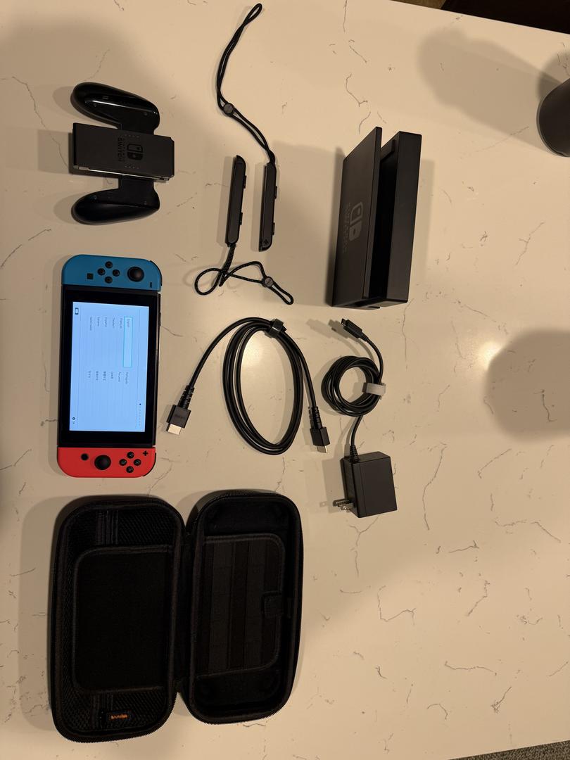 Comes with the original dock, Joy Con straps, Joy Con grip, charger and HDMI. Comes with a soft carrying case as well