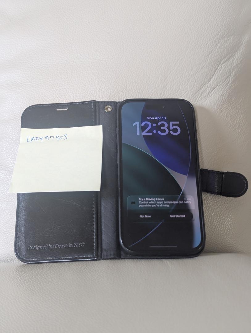 Includes black folio case with phone