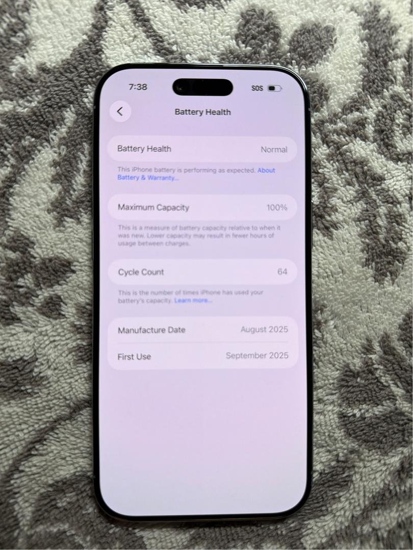 Battery health is at 100% maximum capacity with only 64 cycle counts, providing excellent longevity and performance.
