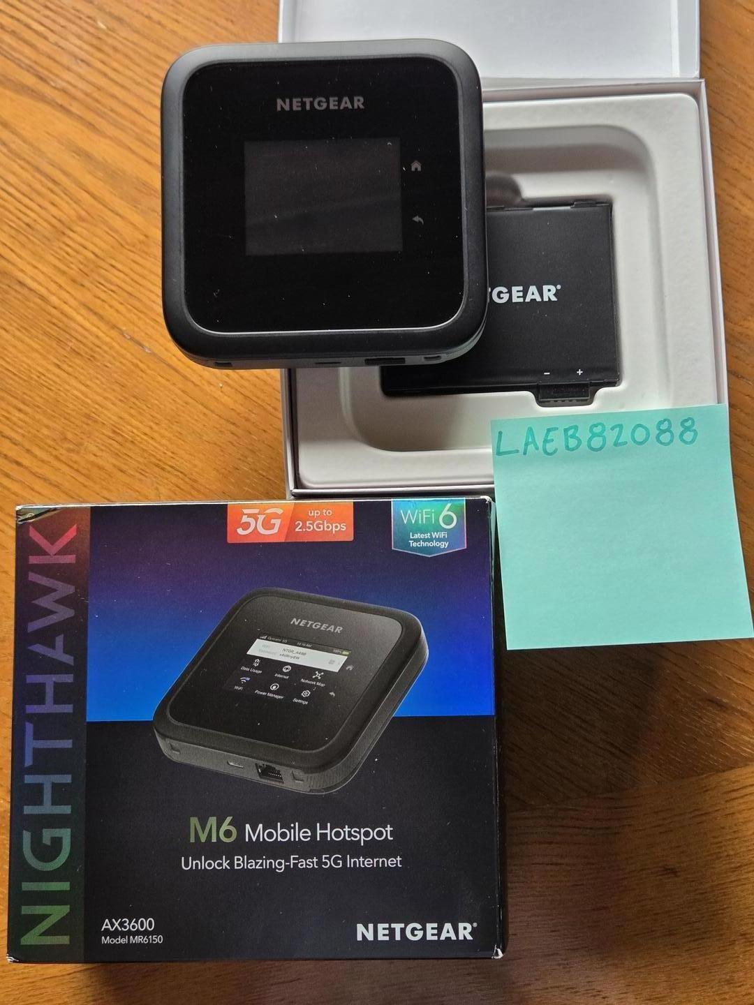Netgear Nighthawk M6 Mobile Hotspot (Unlocked). Box contains device and battery, USB Type-C cable, and AC adapter. Like new, original box and packaging.