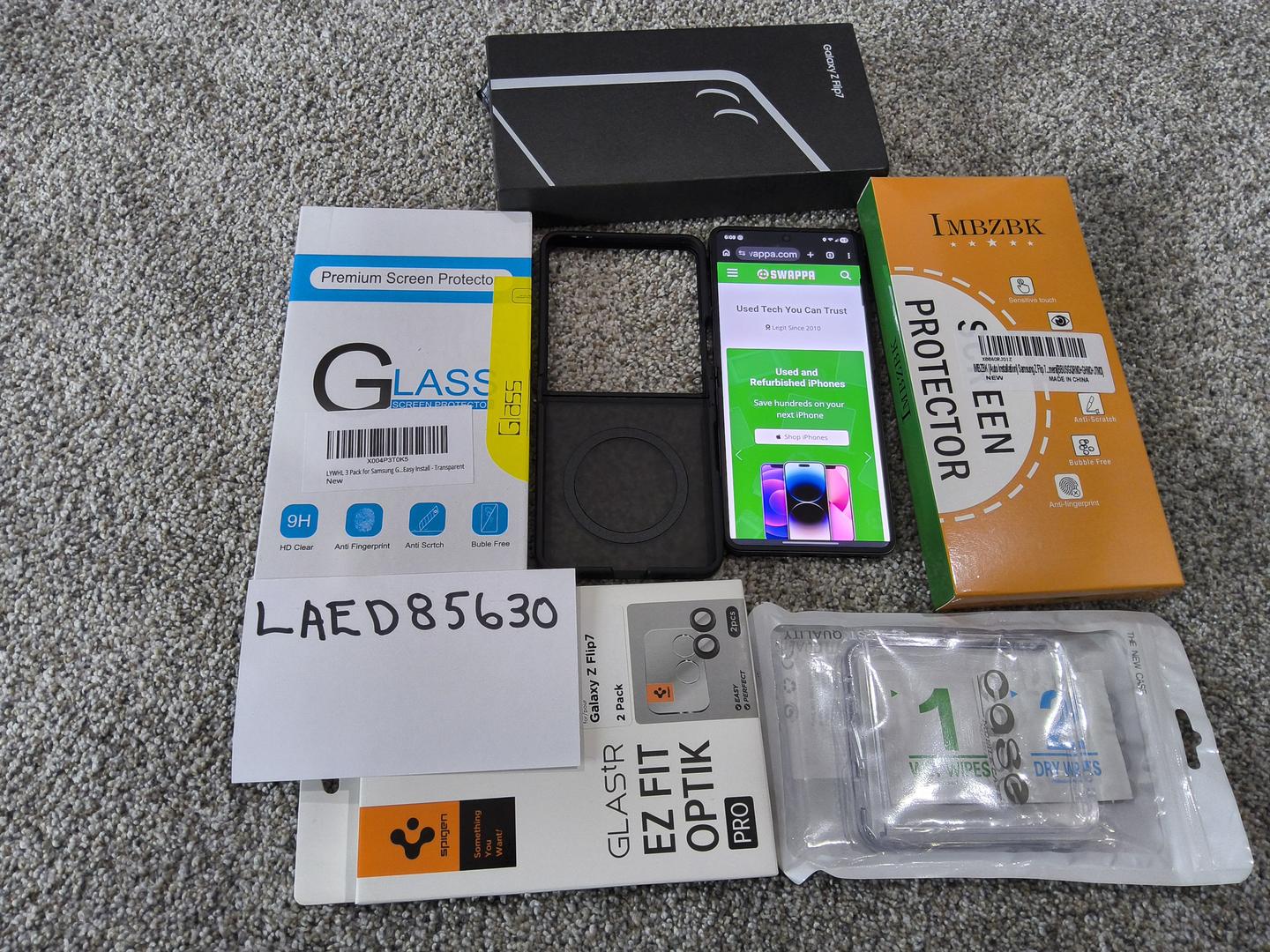 Purchase includes the following: Samsung Galaxy Z Flip7 (Jet Black / Verizon / 256GB) Phone, Original Box, Frosted Black Magsafe Case, Clear Case and Extra Screen and Camera Lens Protectors.