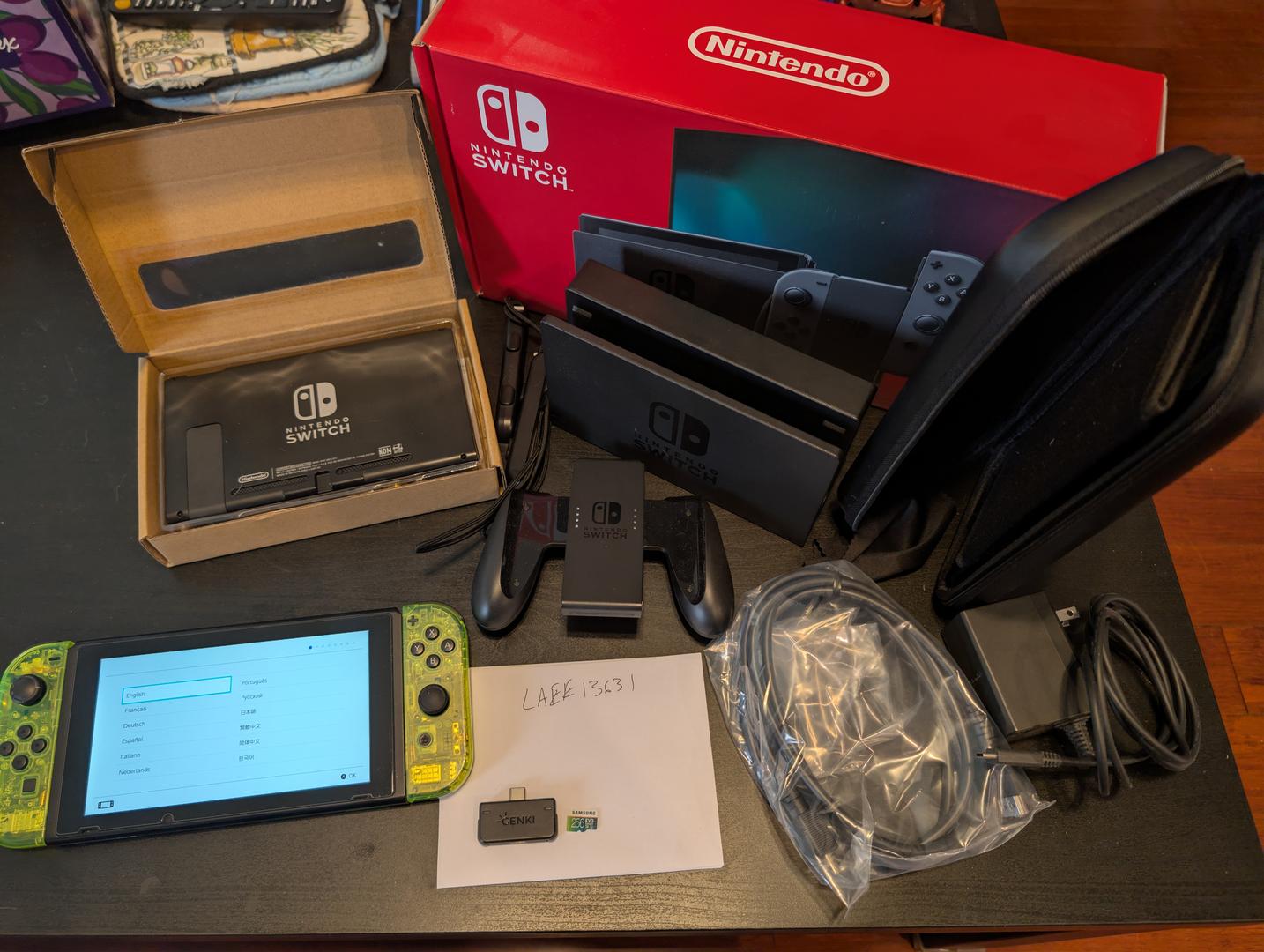 For sale is my Nintendo Switch, including the original box and all original accessories. I'm also including a 256GB SD card and a Genki Bluetooth Audio adapter as well as a travel case. There is a screen protector installed on the switch that I've had since purchasing the console. I reskinned the switch in a translucent green skin, but am including the old stock grey skin with this.