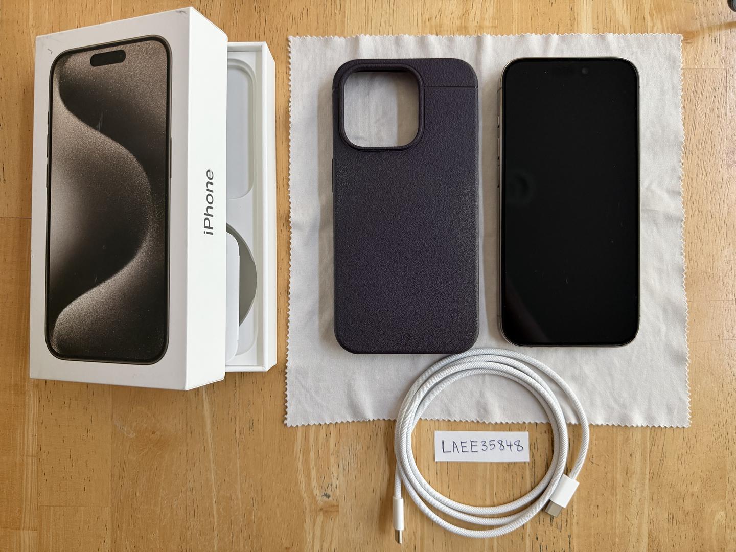 Apple iPhone 15 Pro in great cosmetic condition with very little, if any, signs of use/wear on the phone body. Light scratching on existing tempered glass screen protector but not on screen itself. Will ship with the original box and charging cable, Caudabe Sheath purple phone case, and FloLab NanoArmor 5 tempered glass screen protector installed.