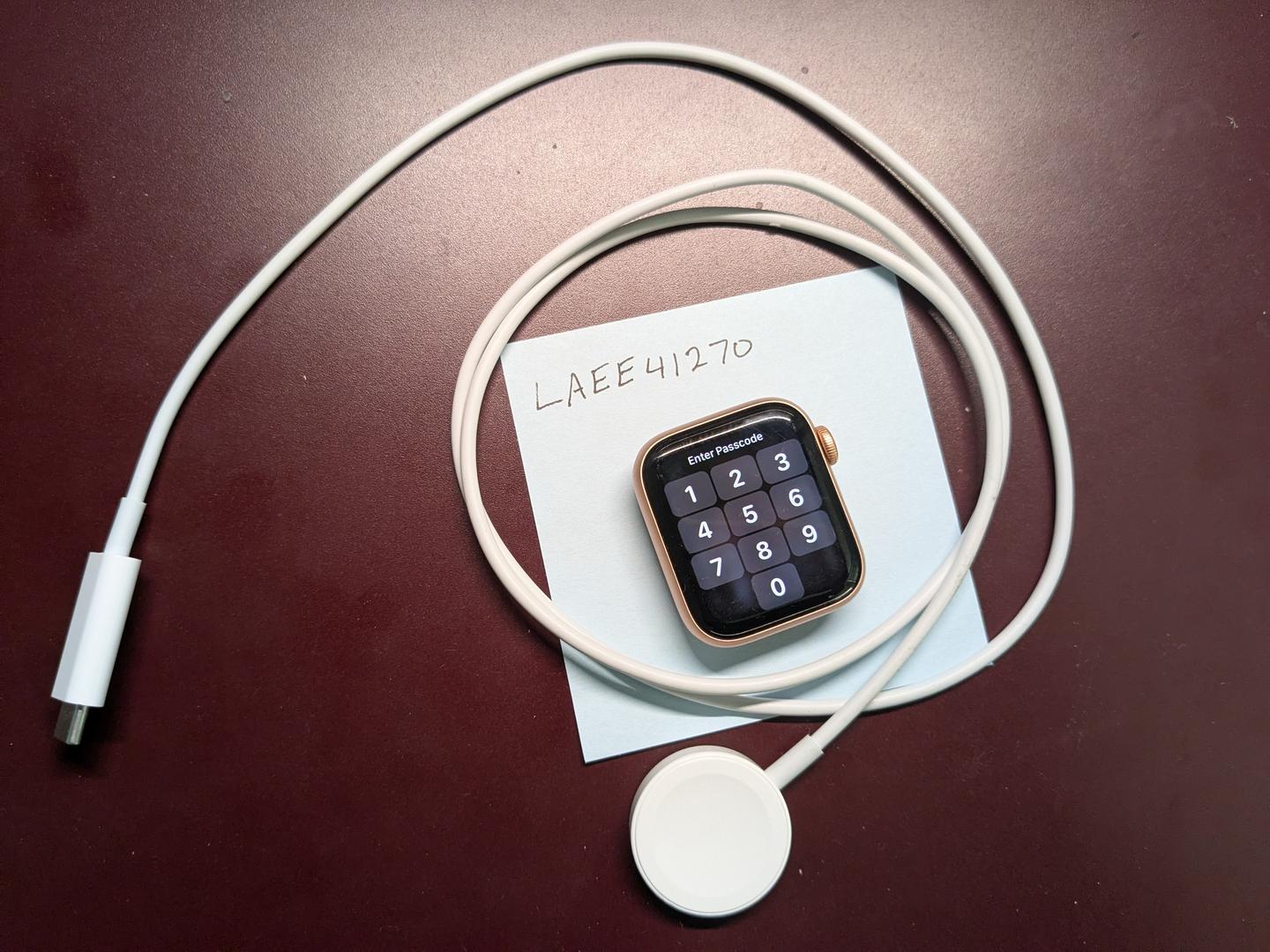 Apple Watch SE (1st gen), gold body with white band. Comes with both the default and the longer band strap. USB-C type connector on the charging cord. Pluggable charger not included.
