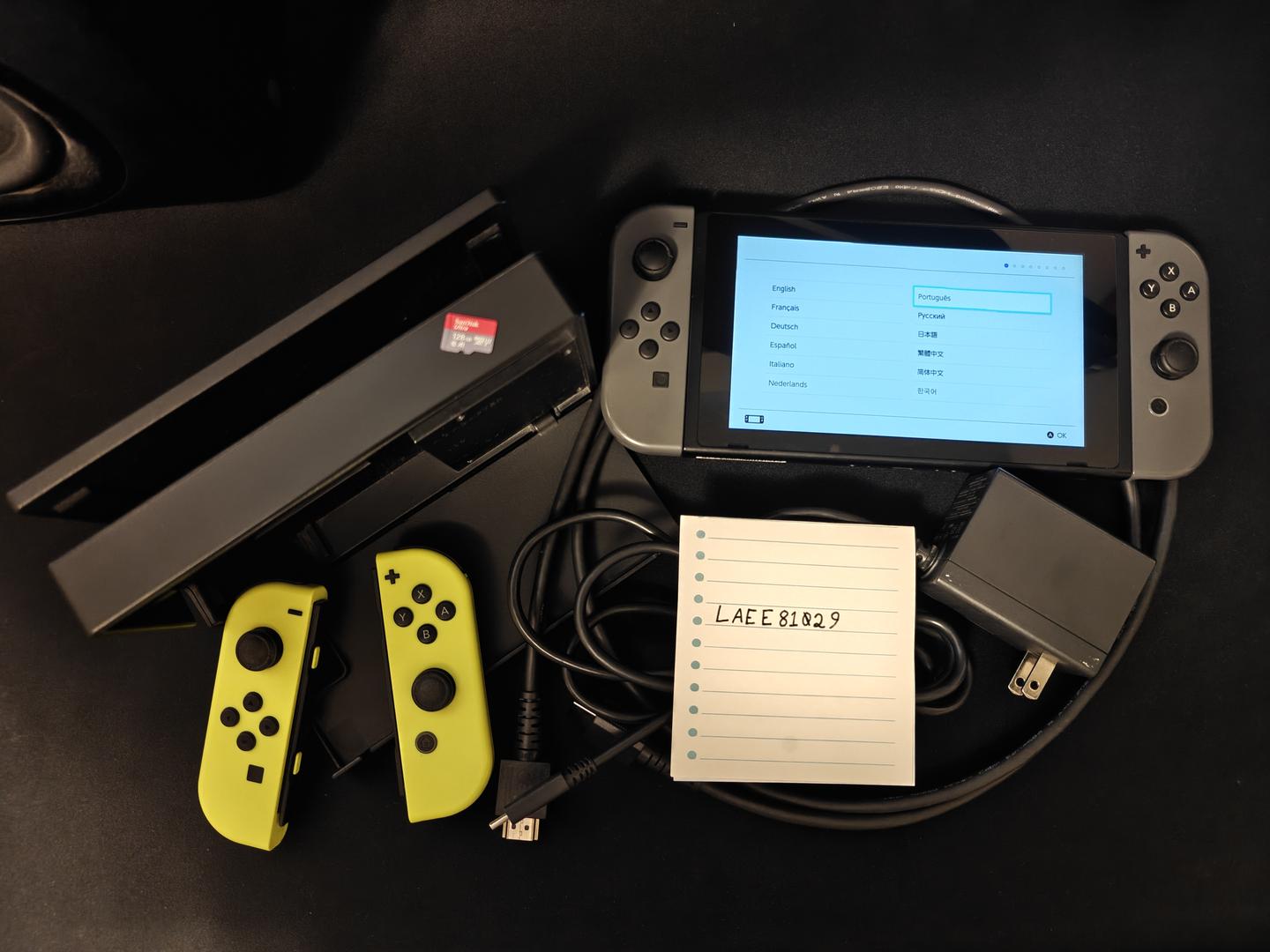 Used grey Switch. Excellent condition. No or very small scratches. Includes docking station, HDMI cable, power supply, Joy Con Grip, and extra set of yellow Joy Cons.