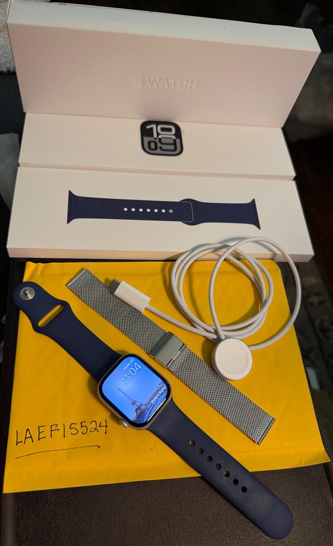 Apple Watch Series 10 GPS 42mm Silver Aluminum Case with Denim Silicone Sport Band - S/M in original box and packaging. Near perfect condition. (See Wear Description) The sleek silver aluminum case is paired with a clean, modern look. The watch includes a 42 mm touchscreen display and is packed with health and fitness capabilities such as heart rate monitoring, ECG, sleep tracking, activity alerts, and a full fitness tracker. It also comes equipped with built-in GPS, a compass, altimeter, and useful everyday tools like a calculator, calendar, stopwatch, and voice assistant support. Designed for durability, it’s scratch- and shock-resistant with water resistance up to 50 meters. The device includes 1 GB of internal memory, multiple alert options (audio, vibration, and light), and comes with an Apple Watch charger. This is an unlocked GPS model with no cellular plan required. Included is the original box, silicone as well as a silver watch band, and Apple charging cable (No Wall Block)