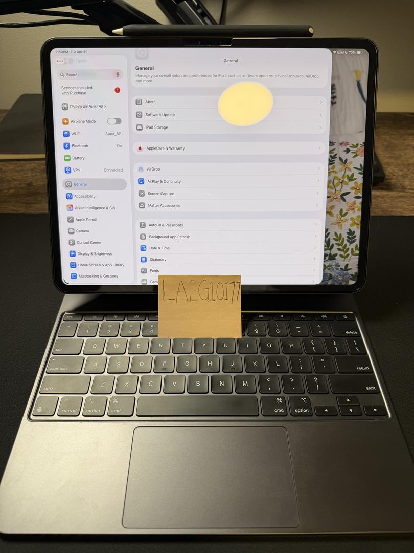 This IPad Pro has been gently used and comes with the Magic Keyboard (with MKBHD Dbrand Skin) and the Apple Pencil Pro. It also comes with the orginal packaging, and an installed tempered glass screen protector.