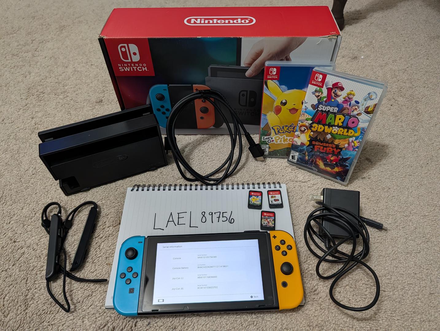 Gently used Nintendo Switch with three games (Pikachu Let's Go, Super Mario 3D World, Mario Kart 8). Includes original box, TV dock, Nintendo AC adapter, and HDMI cable. Everything in good working order.