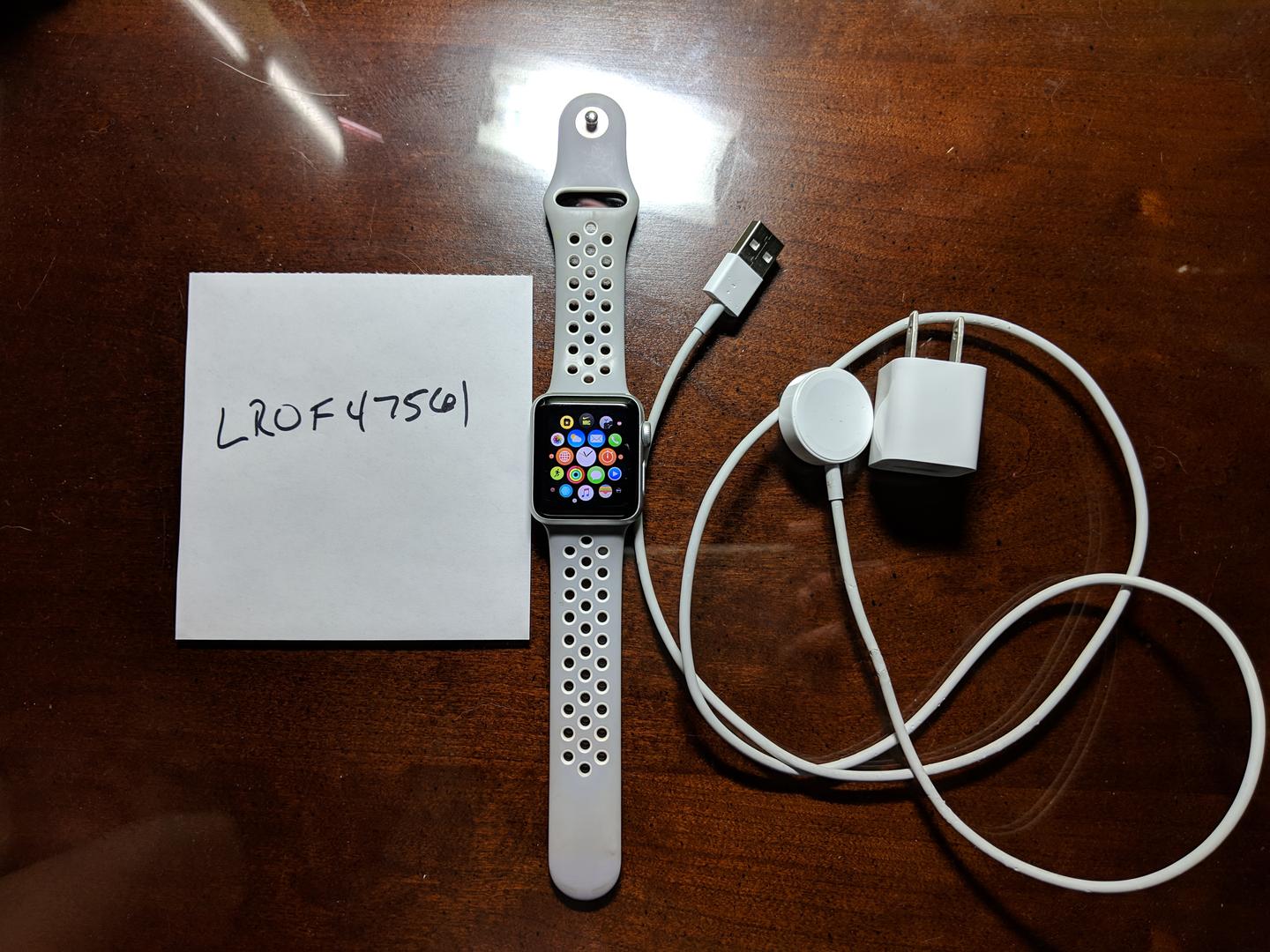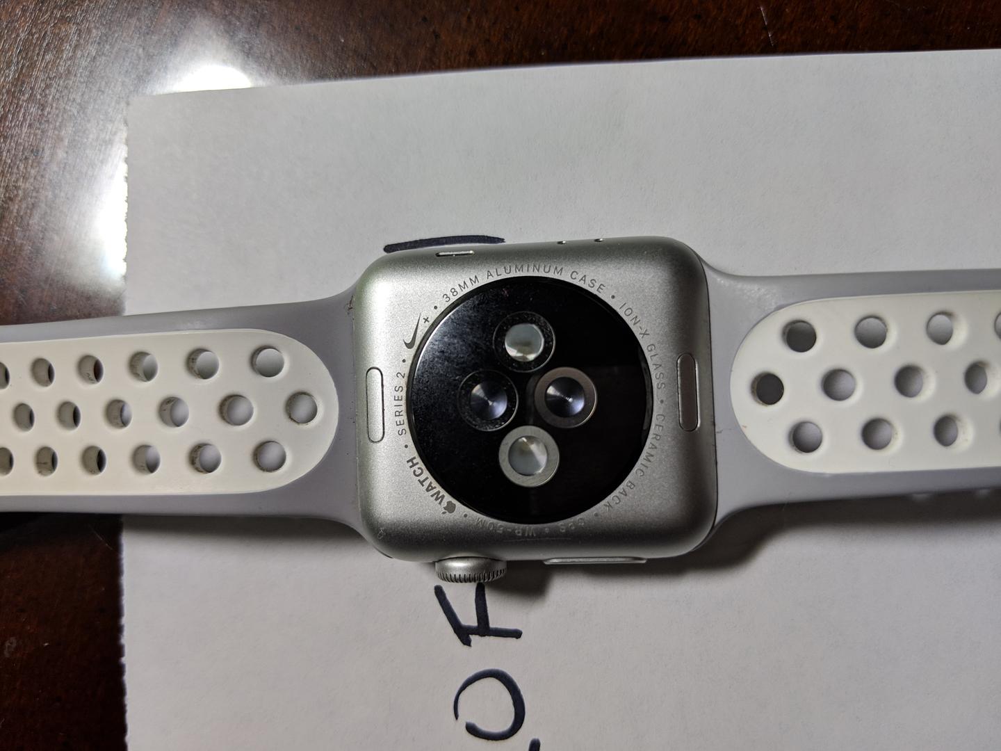 Excellent condition Series 2 Nike+ 38mm Silver Aluminum Apple watch with GPS , Ion-X glass, Retina display, and a ceramic back. There are 2 minor scratches on the outside edges. The scratches do not affect the display but can be seen if you tilt it the "right way". The watch comes with the original band and charger/power cord. Apple Watch Nike+ has the Nike Sport Band and features exclusive Nike watch faces (along with all of the standard watch faces) and close integration with the Nike+ Run Club app.