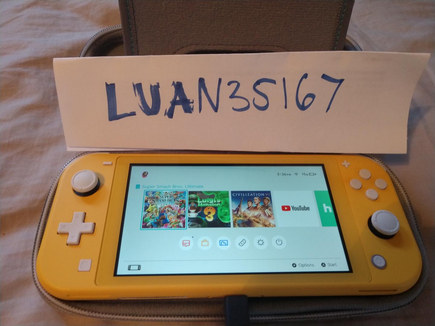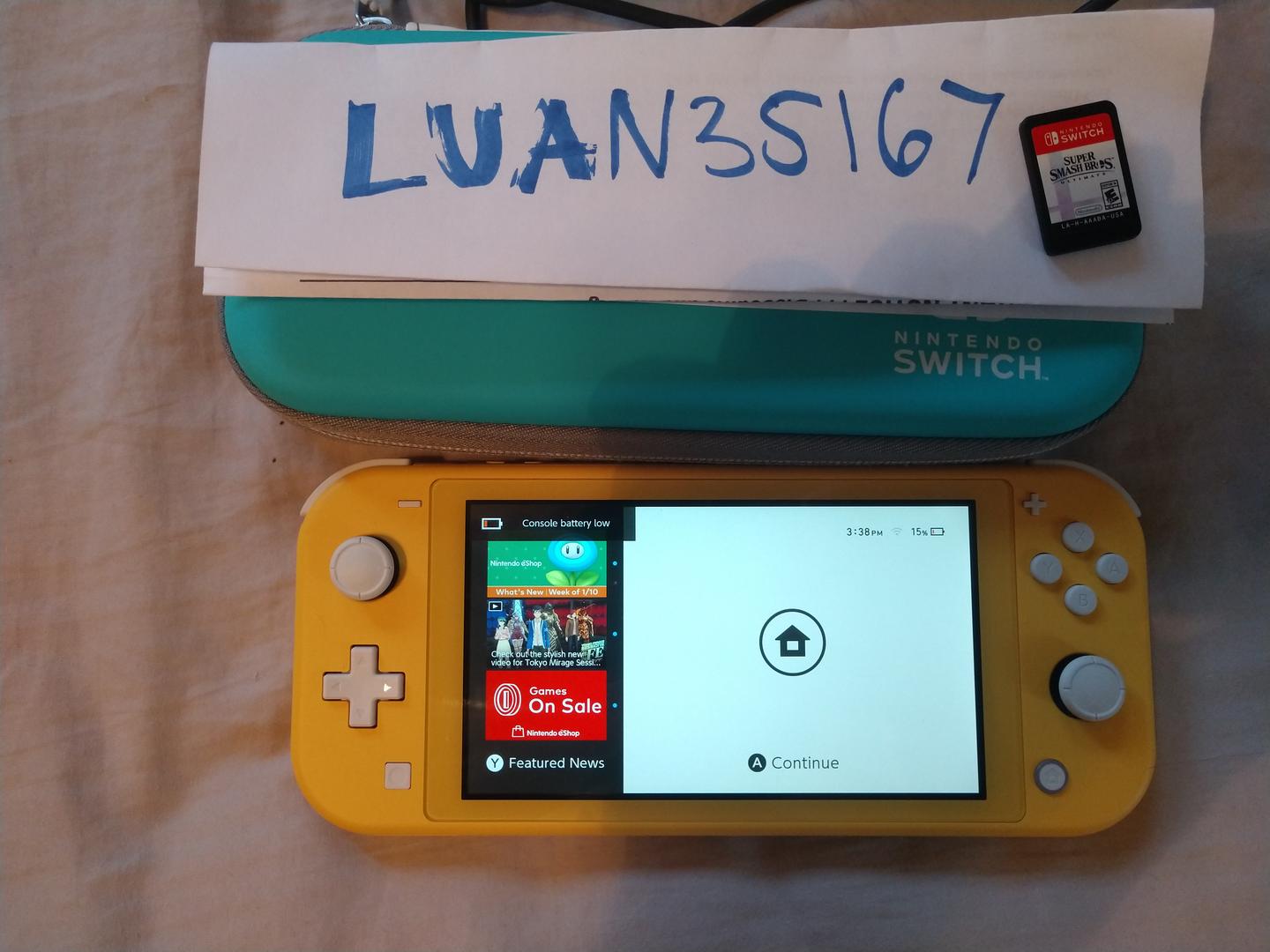 Barely used Switch Lite with original AC cable. It will also come with a travel case and a copy of Super Smash Brothers Ultimate!