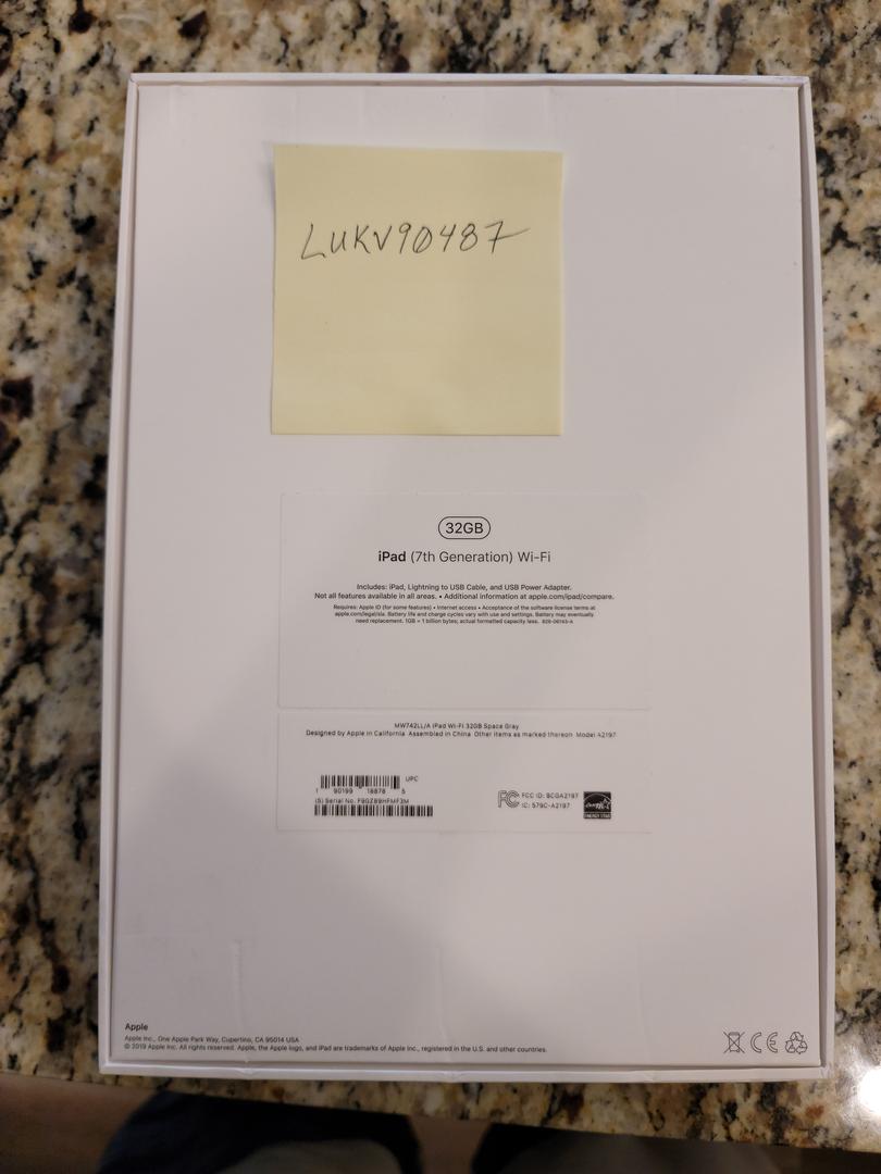 Just selling a mint condition 32GB Apple iPad model A2197 in Space Gray. Comes complete with box, charger, charger cable, manuals, and even the original plastic cover. Any questions or more pictures let me know. Thanks!
