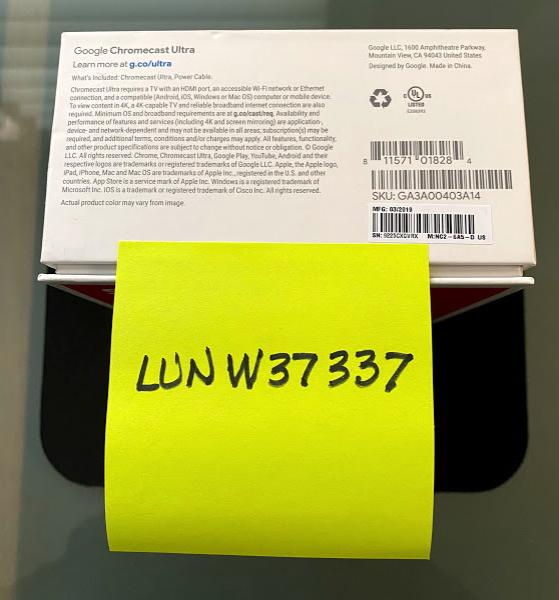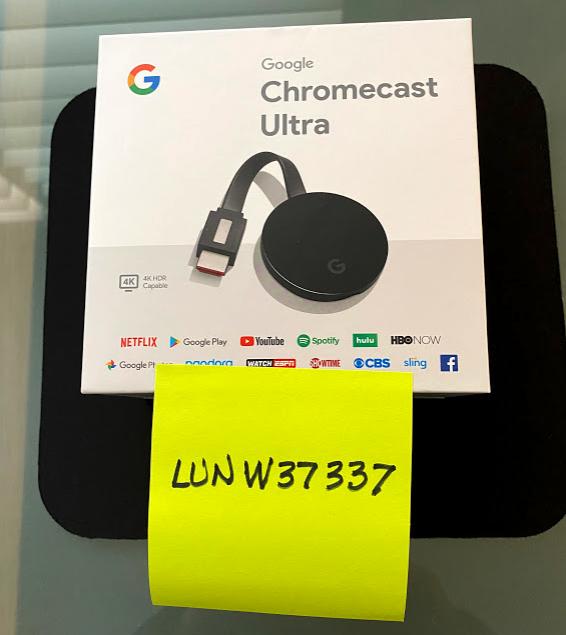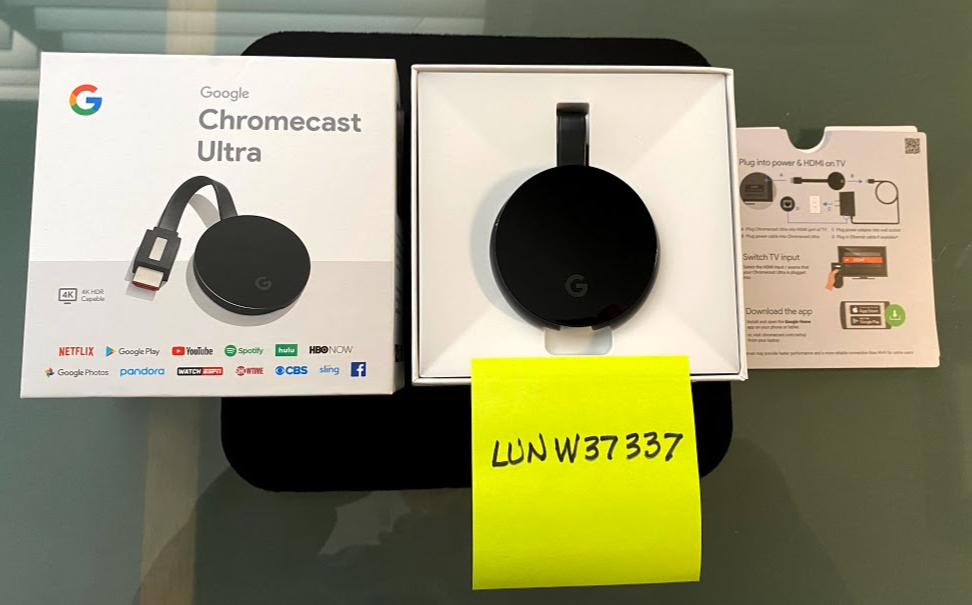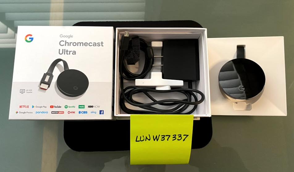 Google Chromecast Black Ultra 4K Mint Condition in original packaging with wall power charger and cable. Model: NC2-6A5-D US, Serial No.: 9225CXGVRX, SKU: GA3A00403A14, perfect condition, purchase June 2019. 4K HDR, 2.4/5 GHz Wi-Fi, Voice Control, Screen Mirroring, Plugs into TV HDMI port, Cable Included, Works with Android, iPhone, iPad, Mac, Windows and Chromebook.