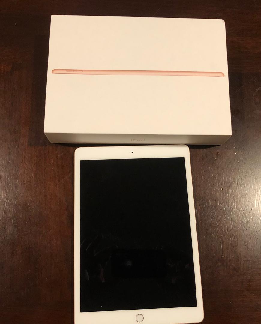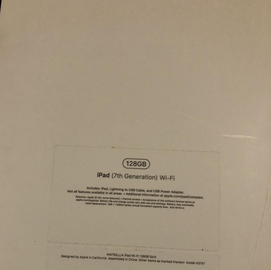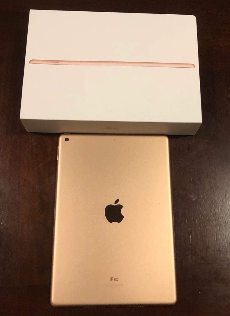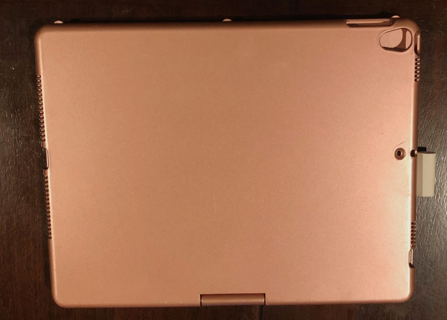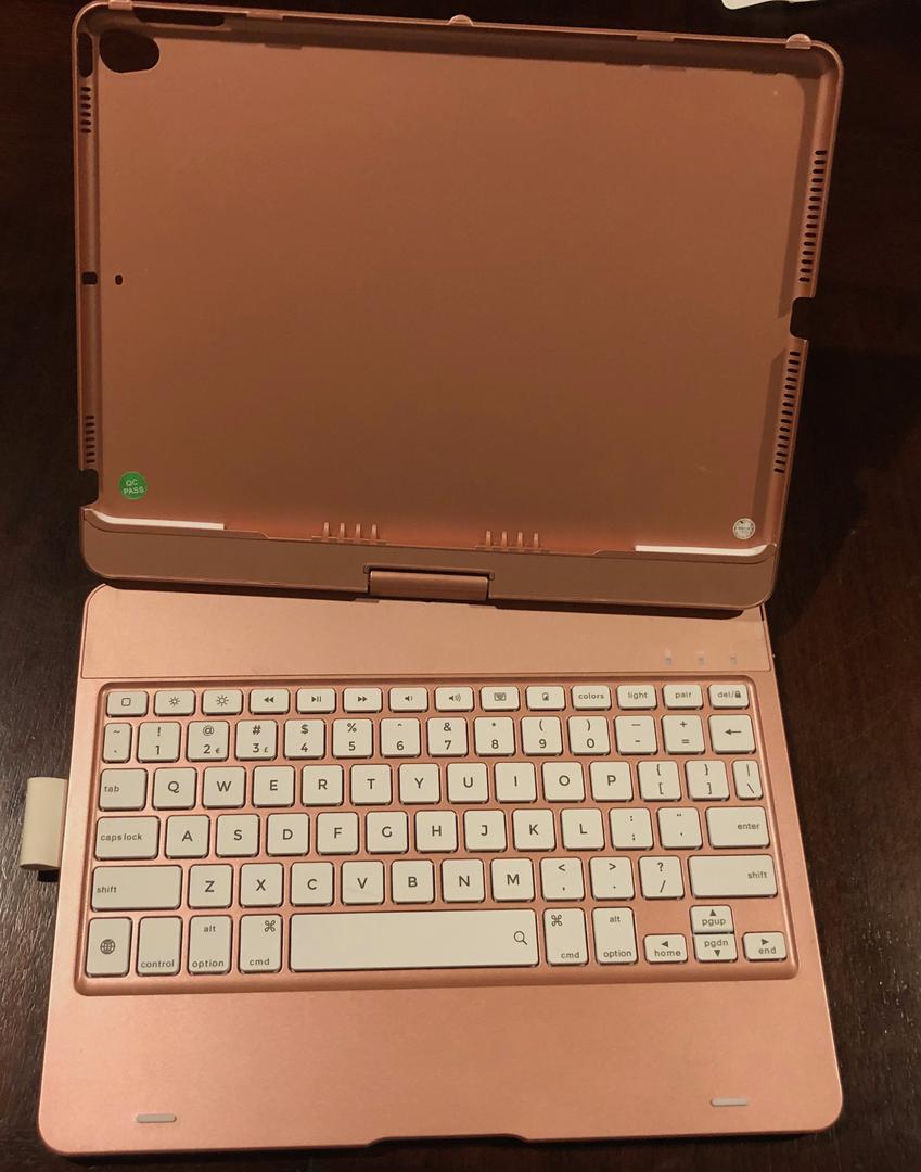 Apple iPad 7th generation - Rose - 128 GB. Includes apple cord and charger. Also includes a YEKBEE iPad case with backlit keyboard that can be recharged with provided USB cable.