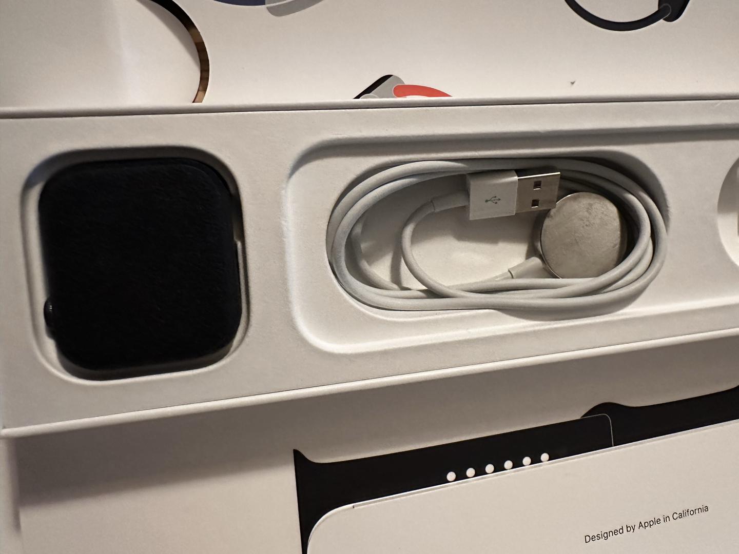 Comes with blue sport band, charging cables, and new Apple (never used) white sport band