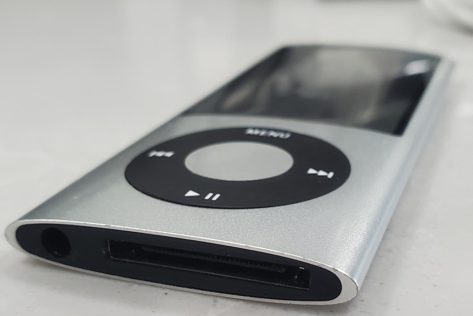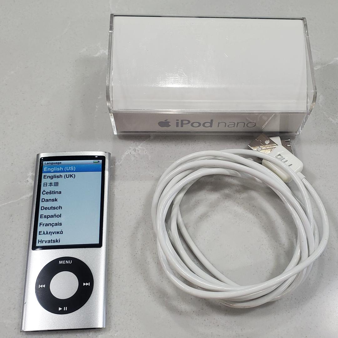 8GB silver iPod Nano with box and cord. Battery doesn't hold a charge for very long, consistent with older Apple products. It will fully charge and discharge, it just discharges fast. Most time I've gotten lately was a day of standby. Works perfectly otherwise and replacement batteries are available online if you don't want to keep it frequently plugged in. Price reflects this condition.