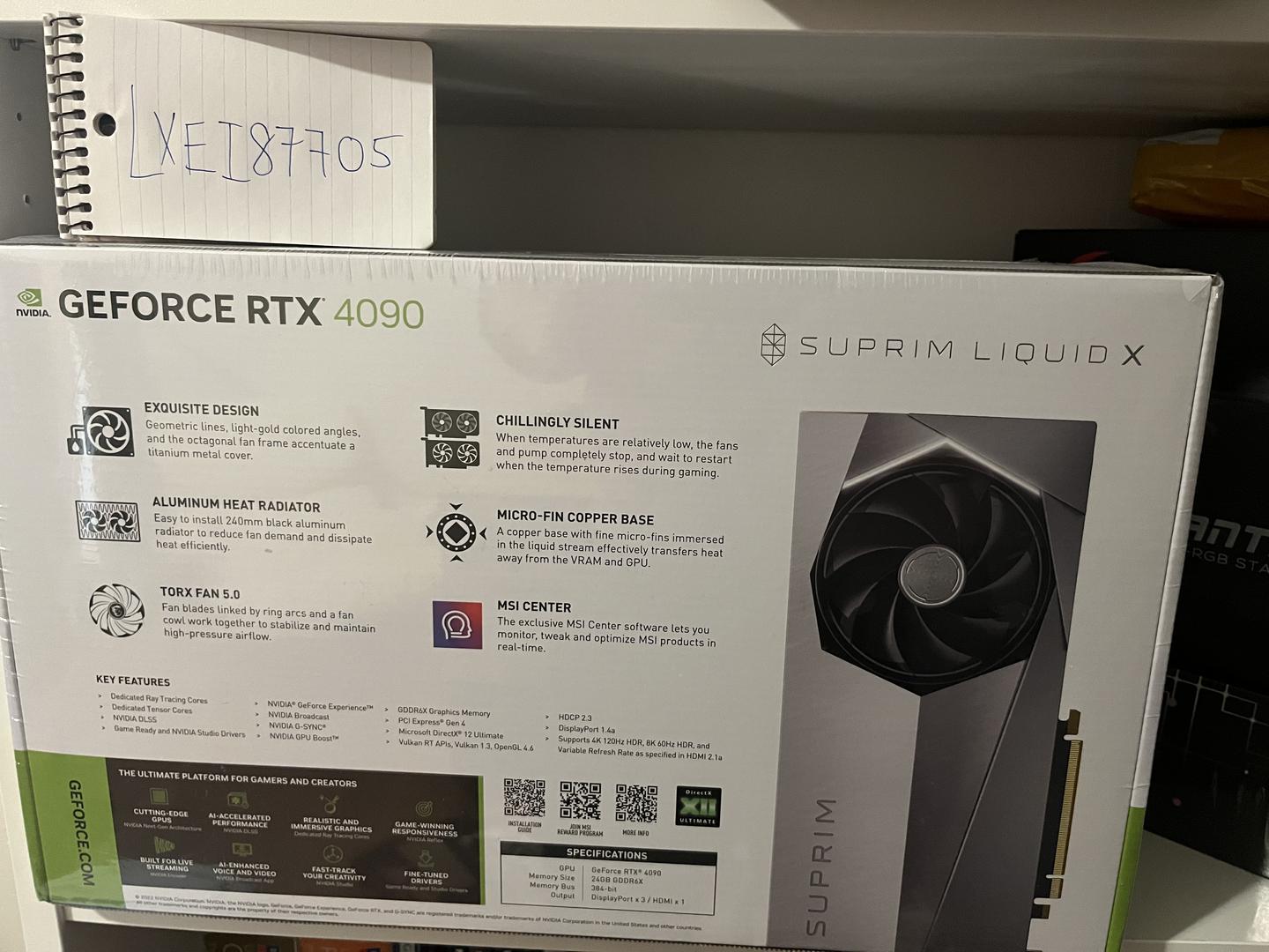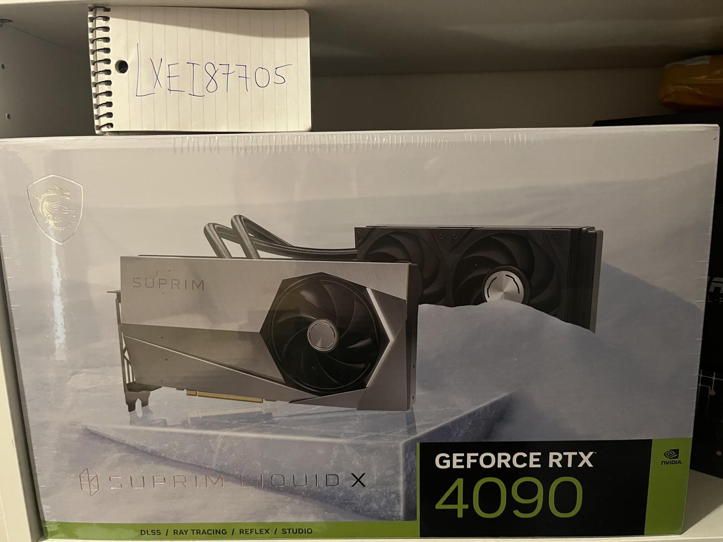 New In-Hand MSI RTX 4090 24GB Liquid Suprim X. Small scratches on wrapping but box in perfect condition, still sealed and without damage.