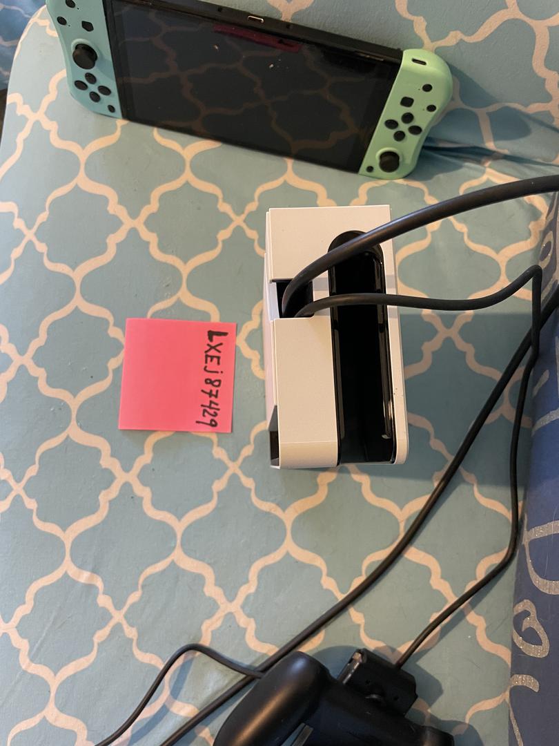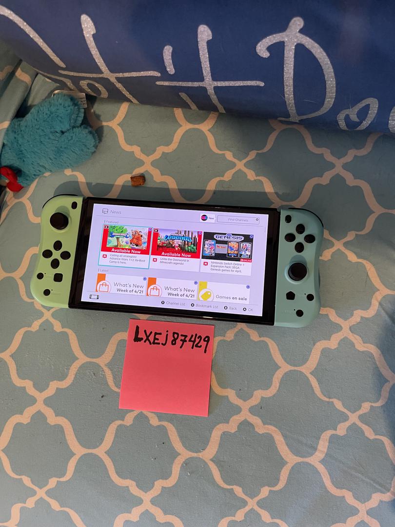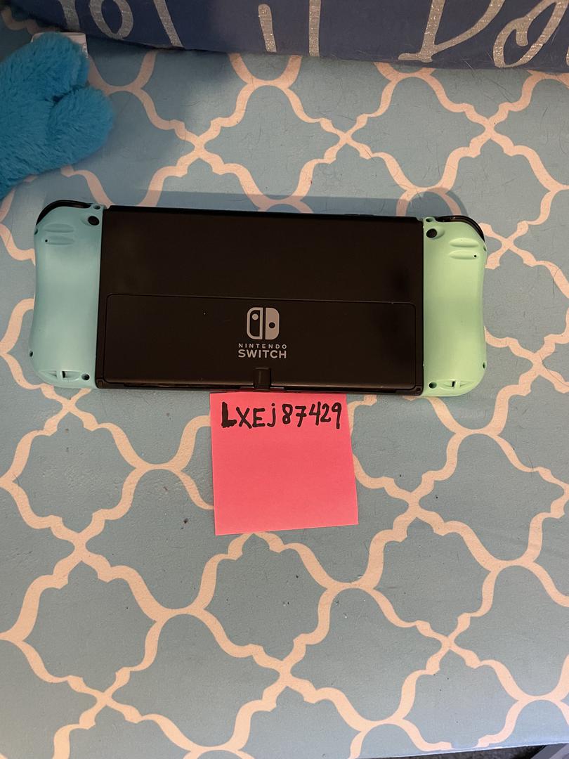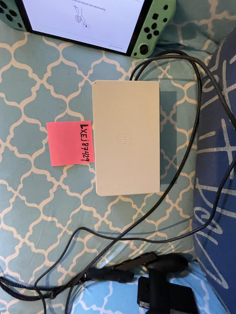 Nintendo Switch OLED with light blue and green controllers, dock, additional controllers, cables, with the 7" OLED screen.