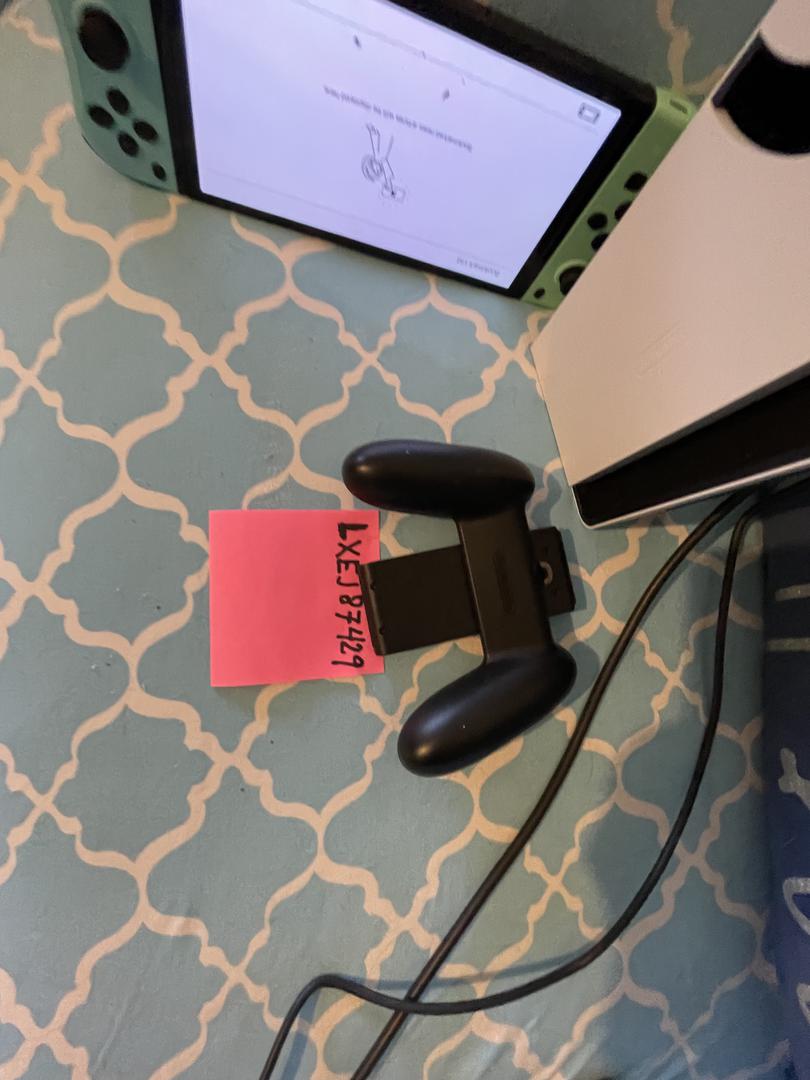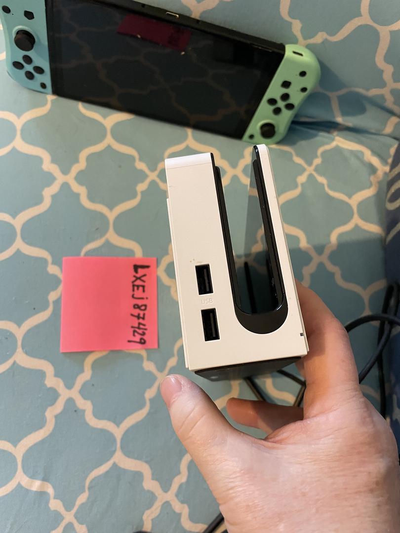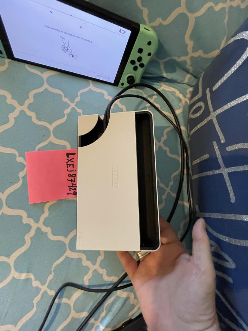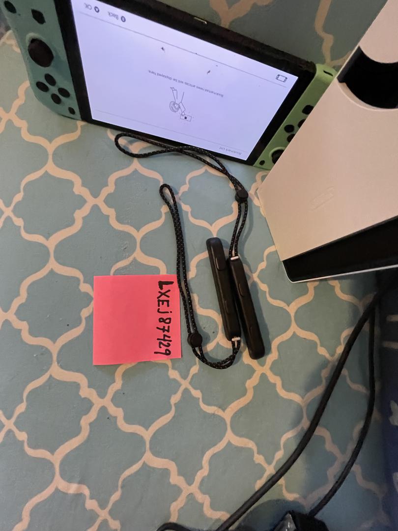 Nintendo Switch OLED with light blue and green controllers, dock, additional controllers, cables, with the 7" OLED screen.