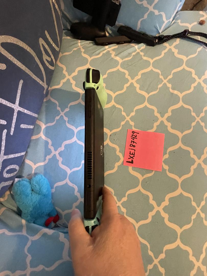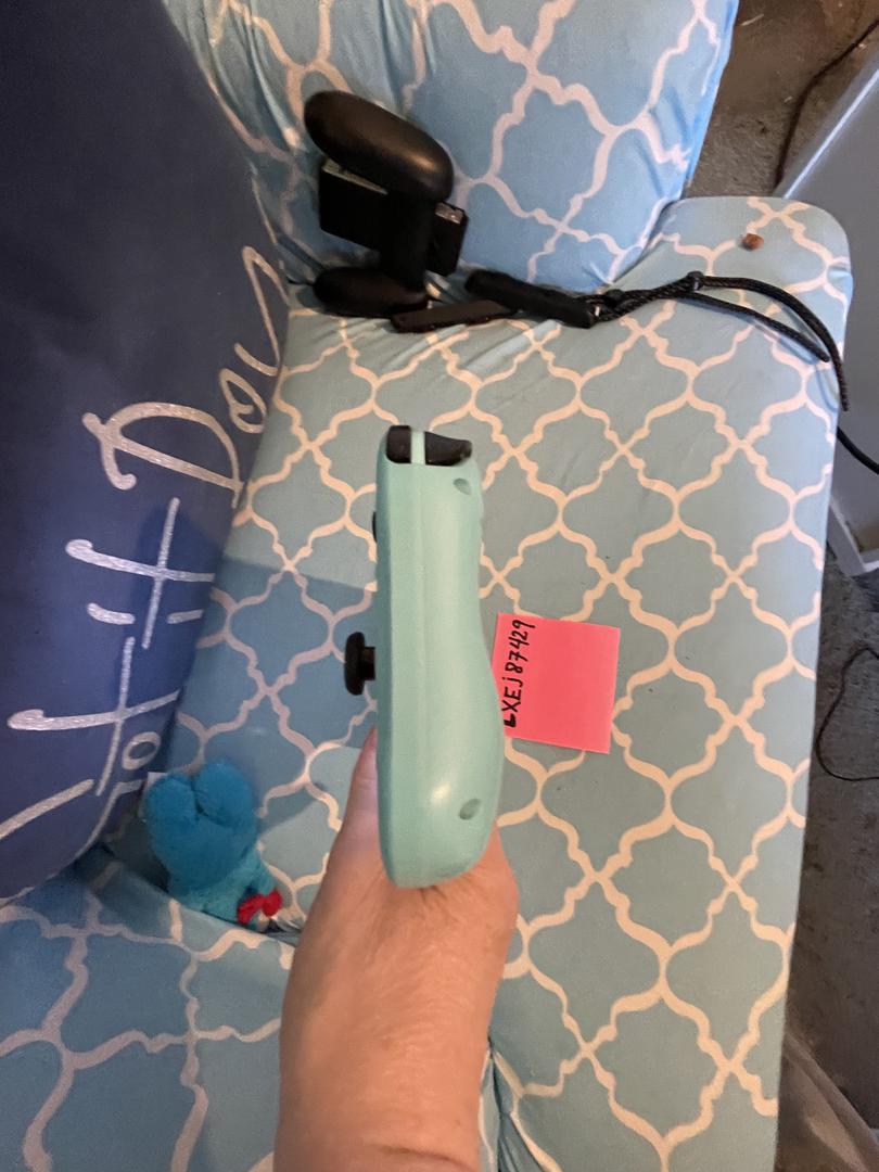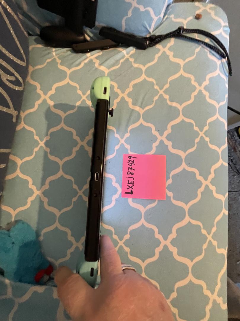 Shiny spots on the back from holding it during game play. Has light blue and light green controllers instead of the white ones.