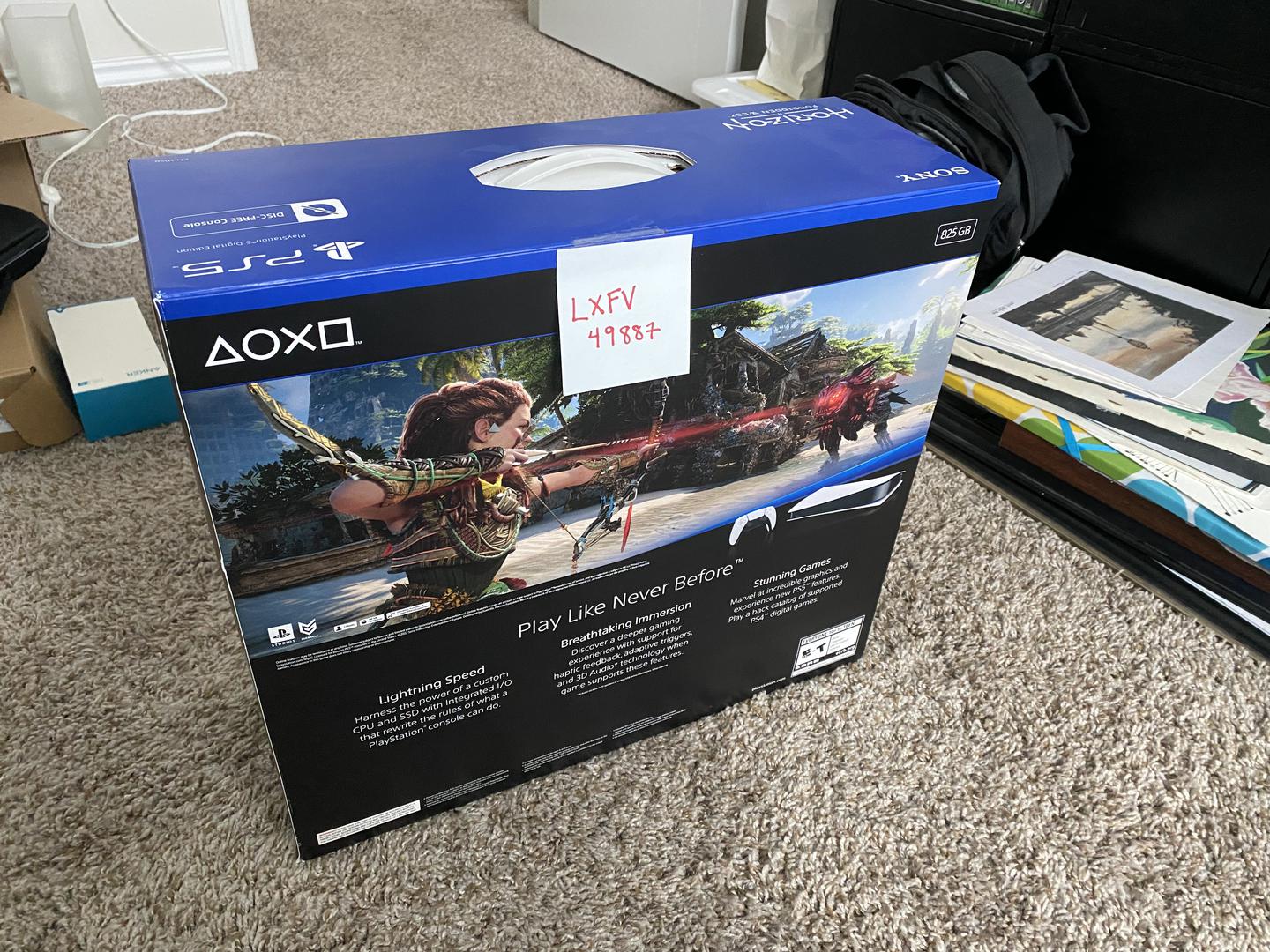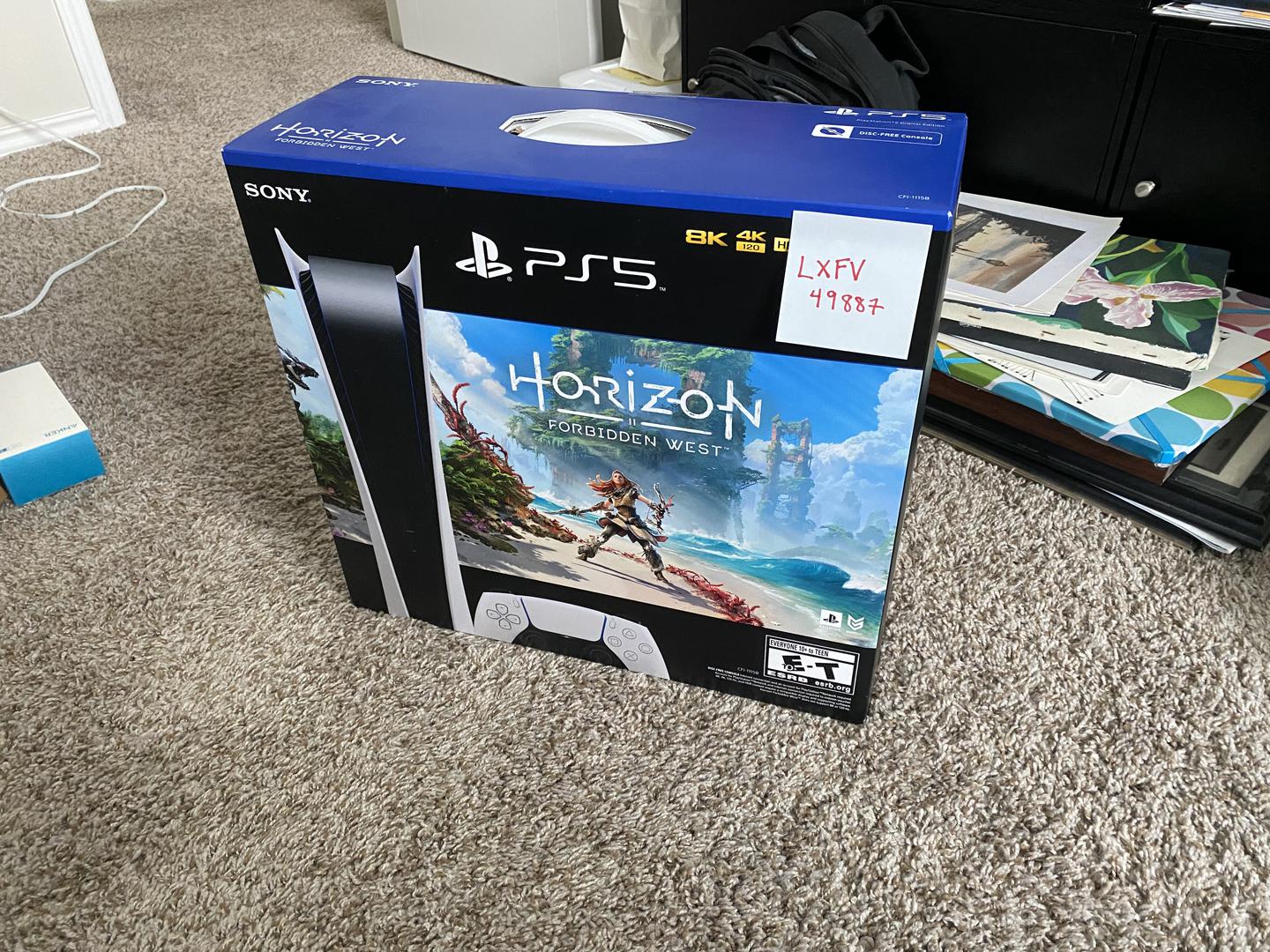 PS5 Digital Edition unopened box w/ Horizon Forbidden Dawn game.