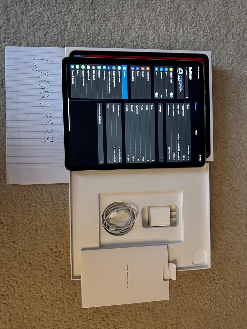 iPad Pro 12.9 128 GB Silver with monthly Apple care, in mint condition. Has Paperlike screen protector on it. It comes with everything that came in the box originally. We can come to an agreement about keeping the Apple Care since it's monthly; if not, I will provide one month of apple care after the purchase, and after the one month, it will be canceled.