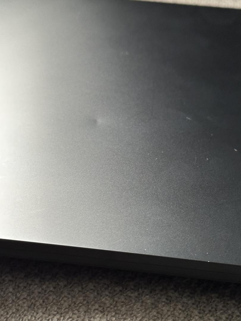Small dent on top, couple of light scratches on top and bottom of the laptop, small scrape in one corner