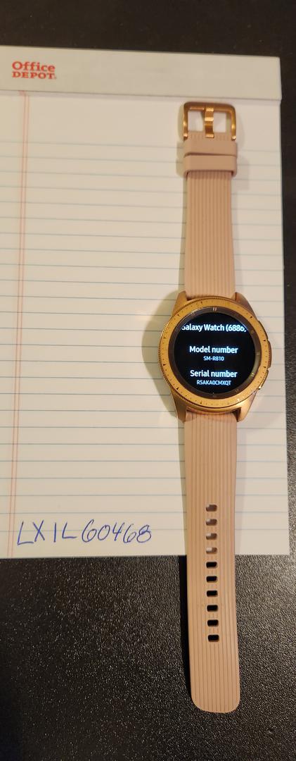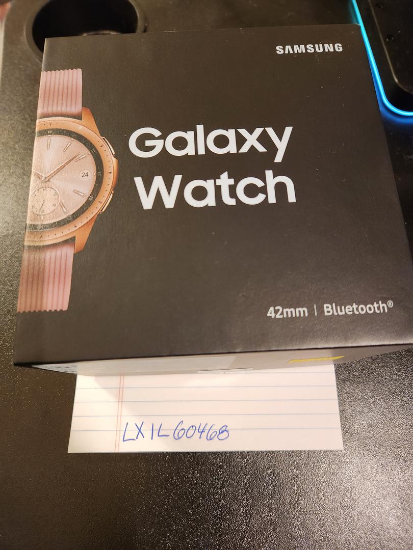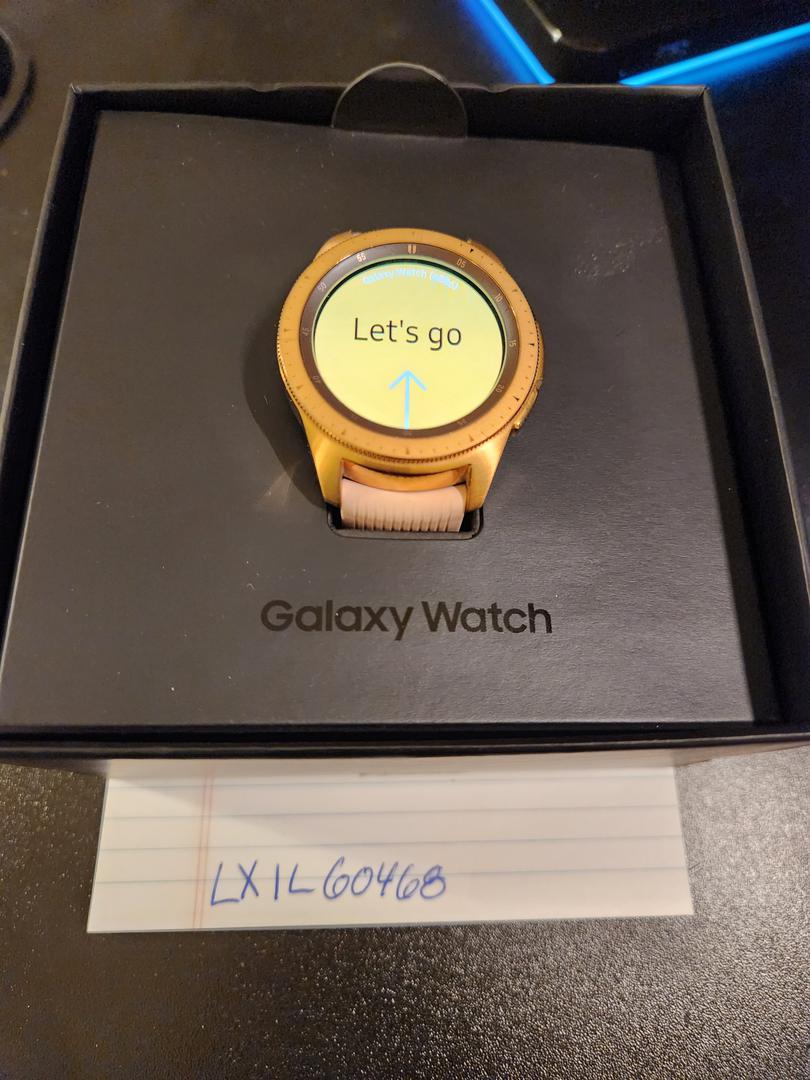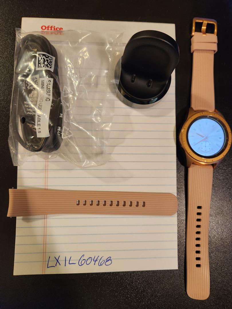 Samsung Galaxy Watch, 42mm size. Rose Gold case with matching Samsung pink band. Purchase includes watch with short and long band pieces, charger, usb cable, and original box.