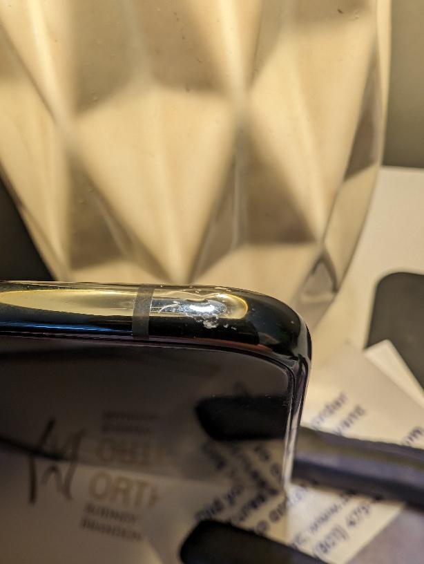normal wear and tear. small scuff on the corner. dbrand leather skin attached since day one. comes with $79 pitaka carbon fiber case.