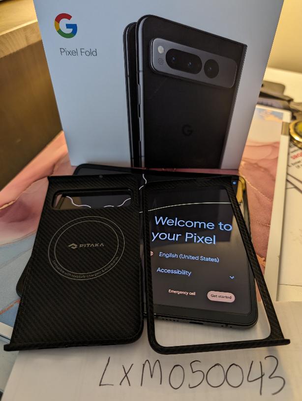 Pixel Fold with dbrand leather skin and $79 Pitaka carbon fiber case