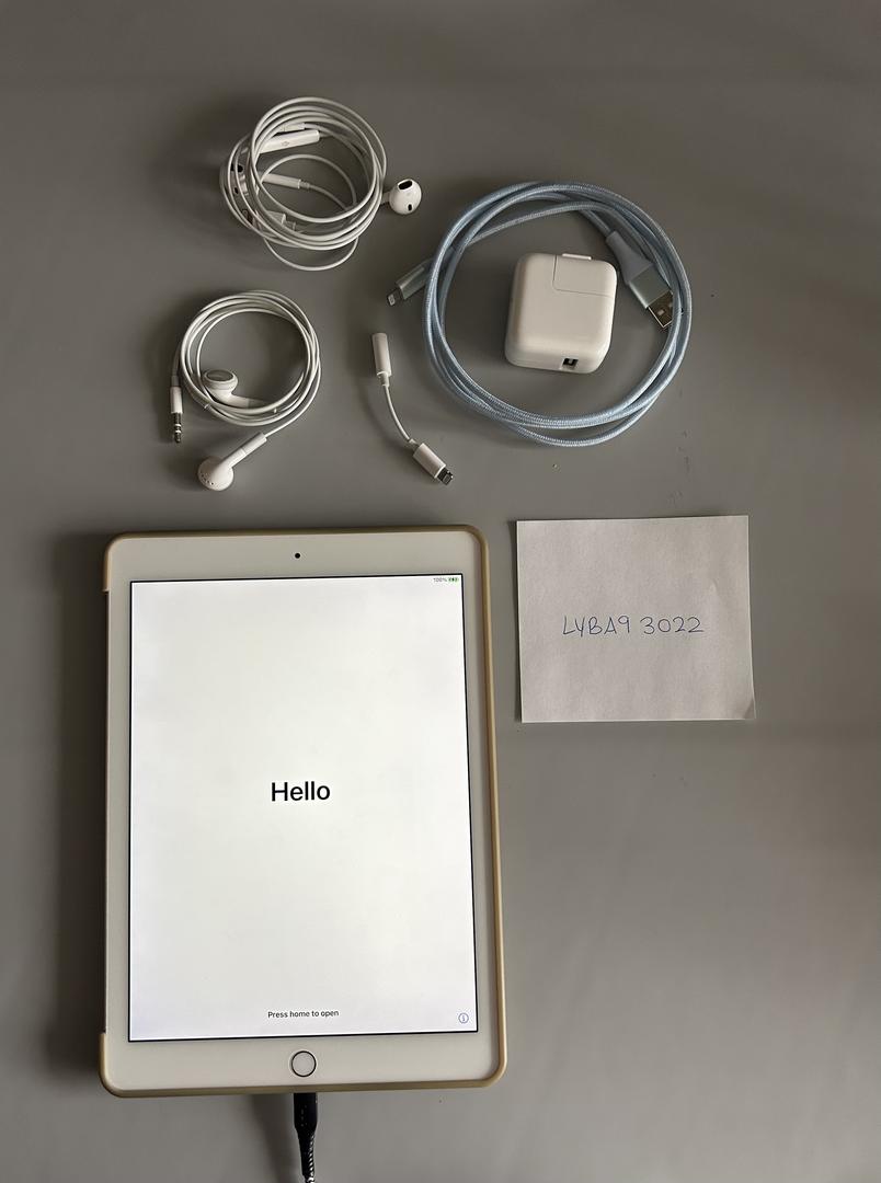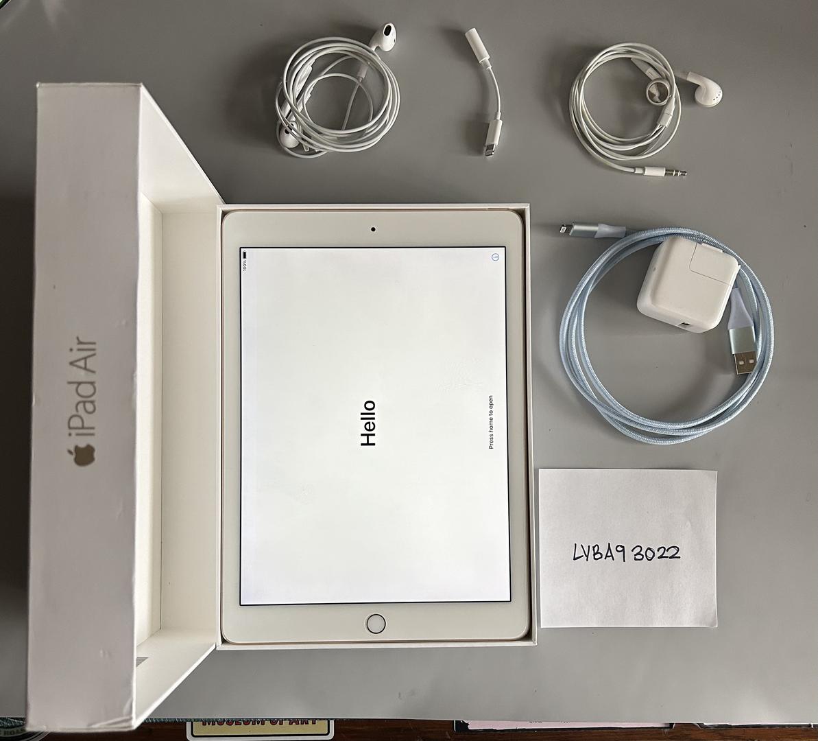 Included is a Gold, 16gb iPad Air 2, with original box, charging cord, and earbuds.