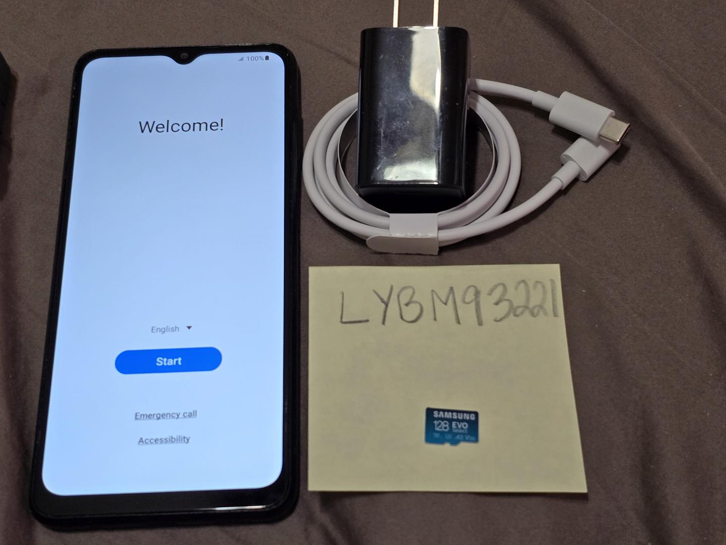 Includes 128GB Samsung Evo Select microSD card, generic AC adapter and generic USB charging cable.