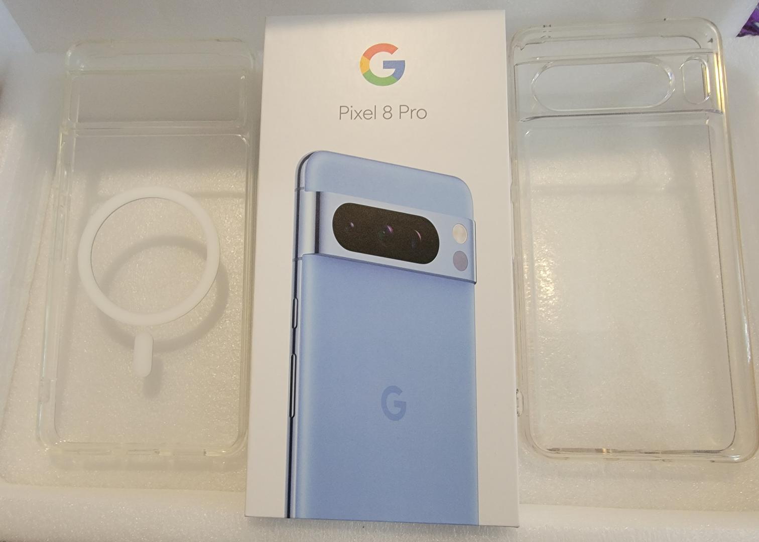 Awesome pixel 8 pro, 512 g storage, 12g ram. Beautiful bay blue. Box included plus 2 clear cases. Normal wear made some fine scratches on screen. Otherwise great phone. Very pretty also.