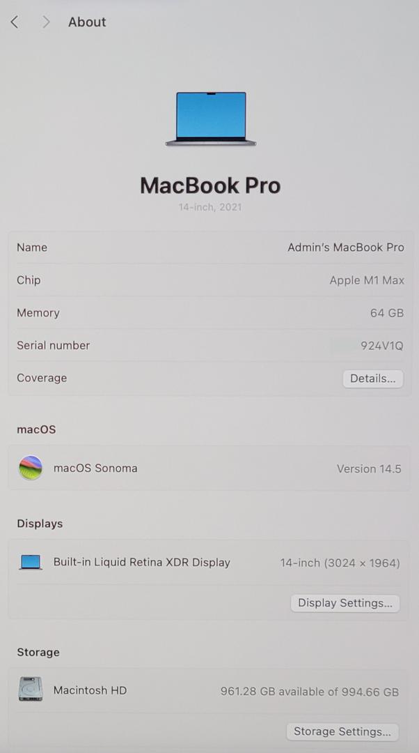 Apple MacBook Pro | 14-inch| 2021 | M1 Max | 64GB | 1TB | Gray +Applecare
