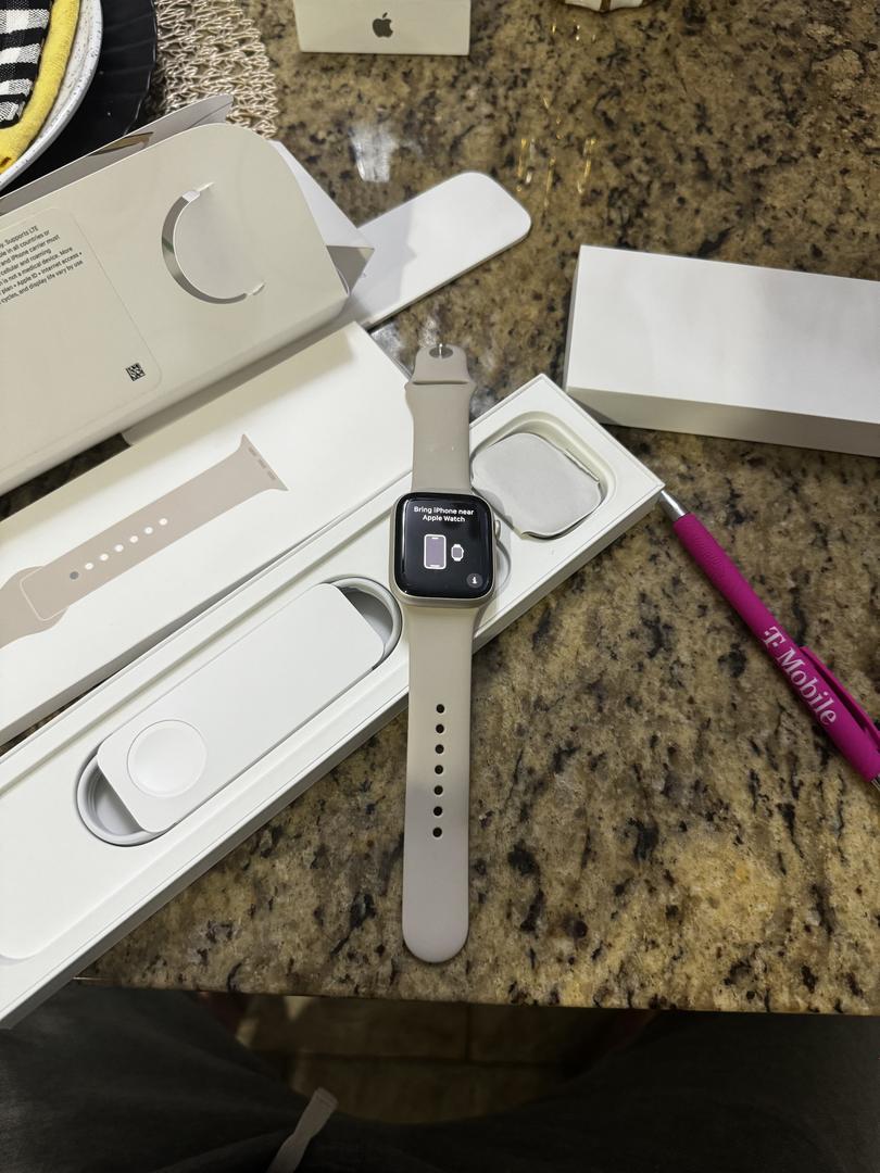 Great Condition - 45mm Apple Watch Series 8 - Unlocked. Originally T-Mobile. Aluminum w/ Starlight color. Sport band. With original box w/ unused accessories. Last Apple watch model with Oximeter for Blood Oxygen reading!
