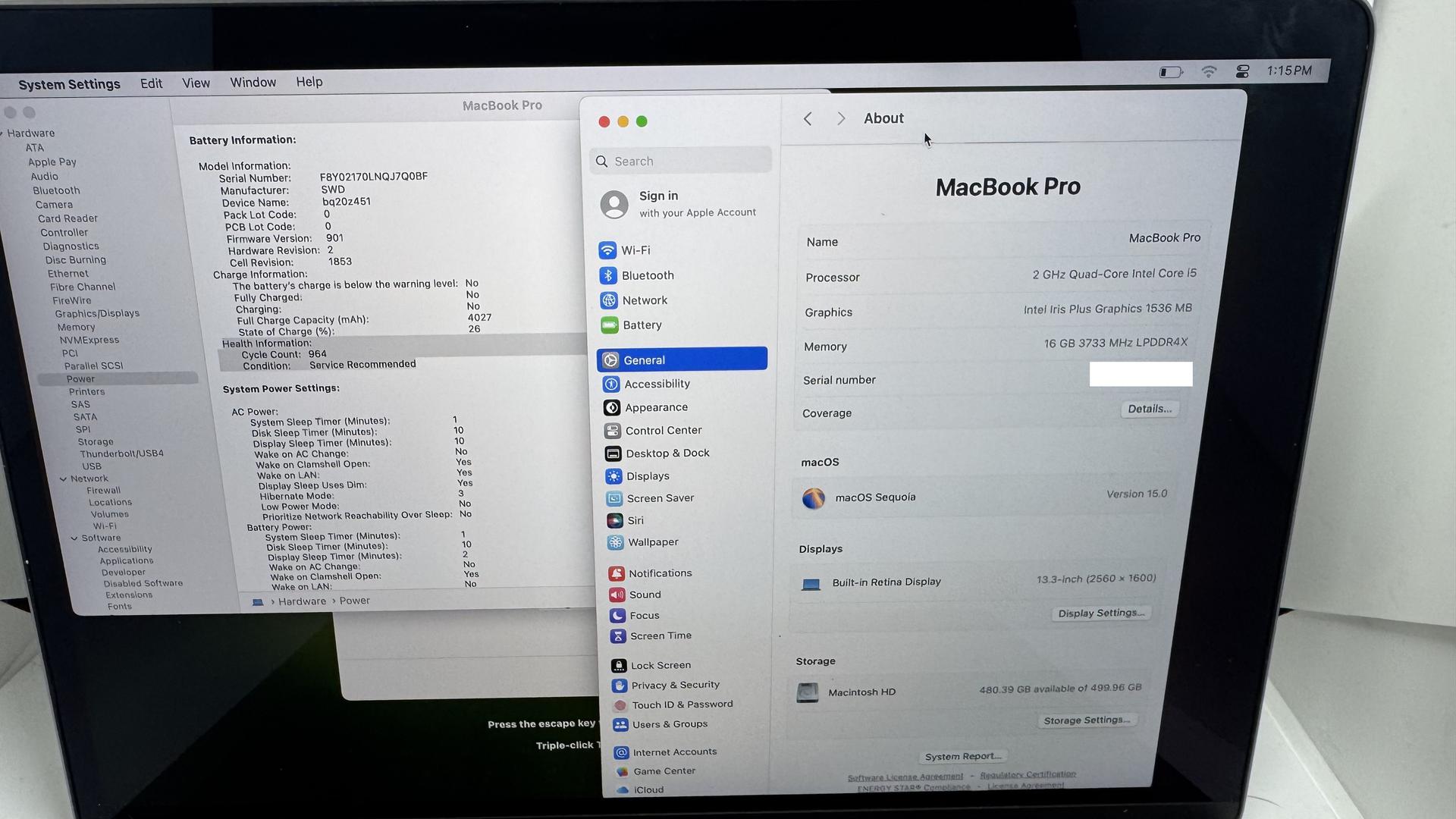 Battery cycle count is at 964 and shows a Service Recommended but the Battery does hold a charge.