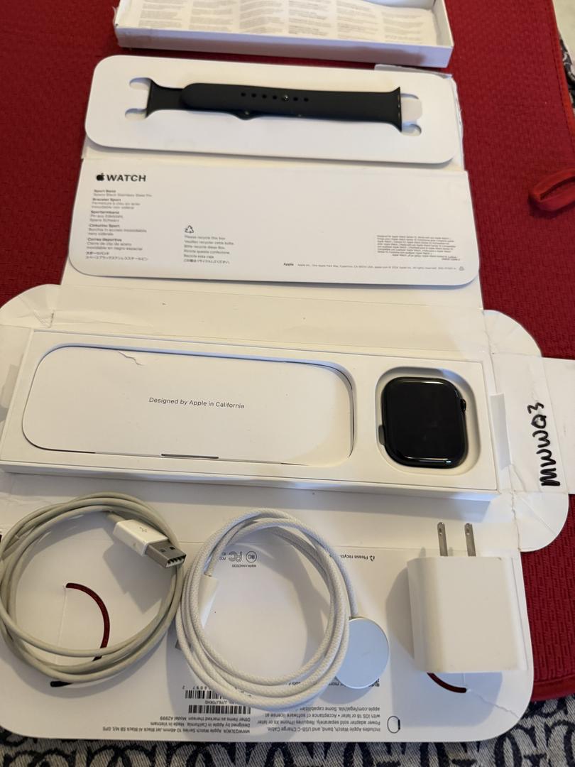 ###Earth Day REDUCTION###. This all Black mint condition Apple Watch series 10 46 MM still has original boxes and paperwork just unboxed and turned on once. Includes an extra USB-A charging cord and a 20W charging brick.
