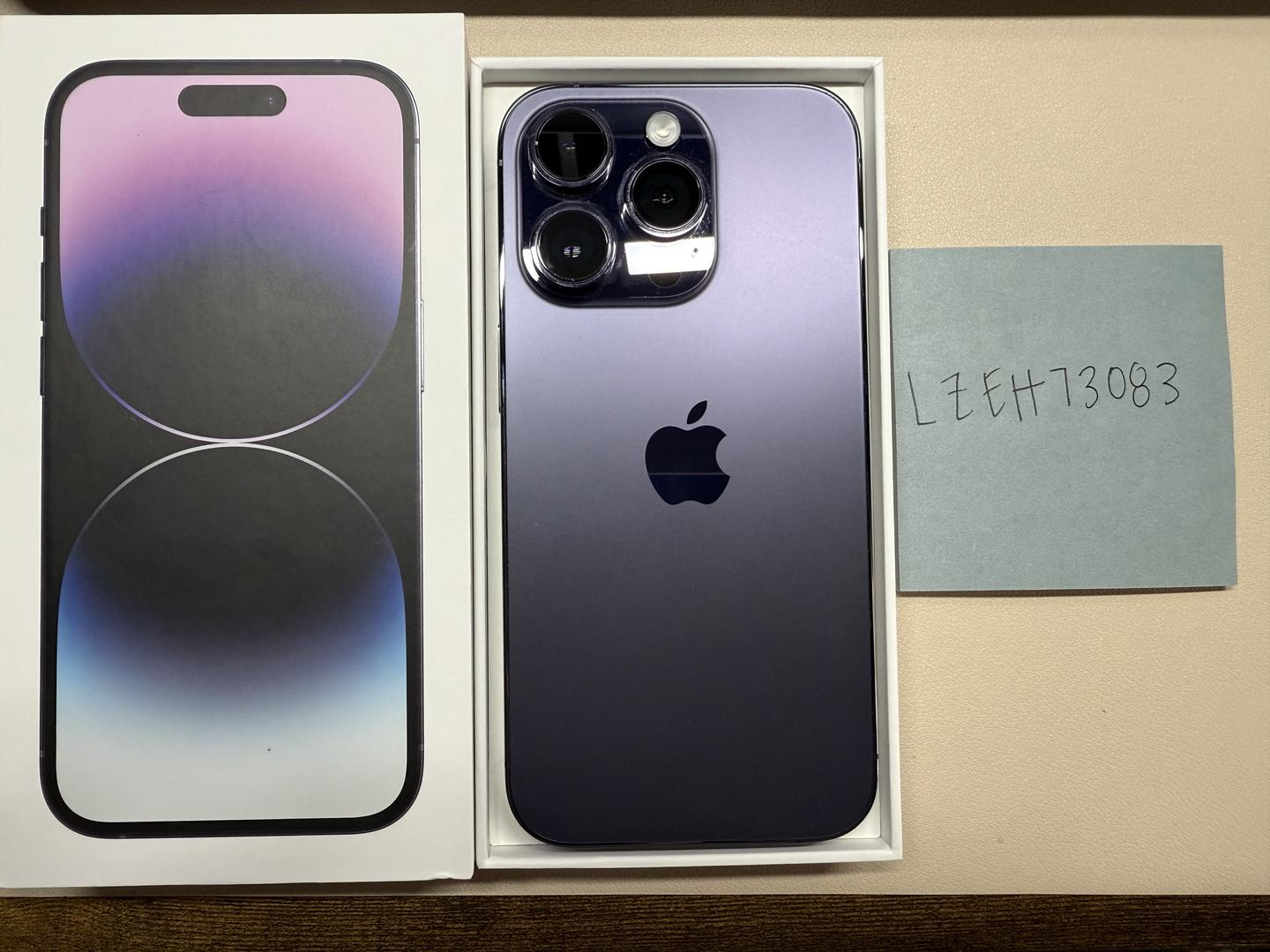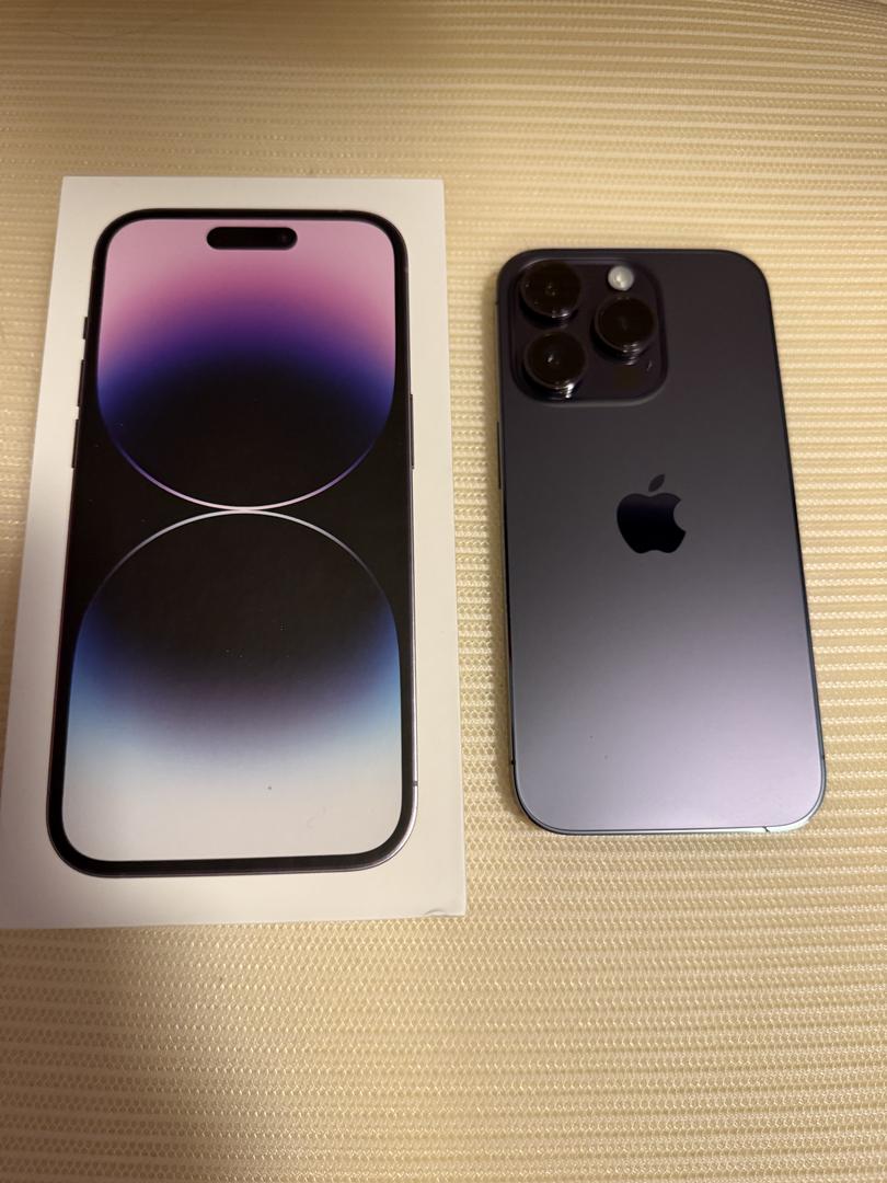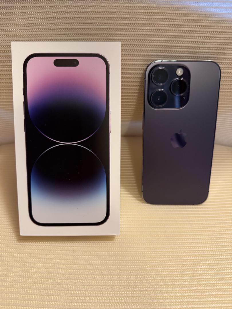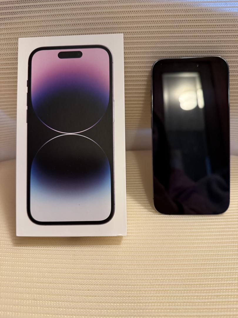1 owner - Excellent condition Apple iPhone 14 Pro 128g in deep purple. 84% battery health. No scratches or cracks. Very small spot pictured on silver border, not actual lens. Does not affect camera, also pictured.
