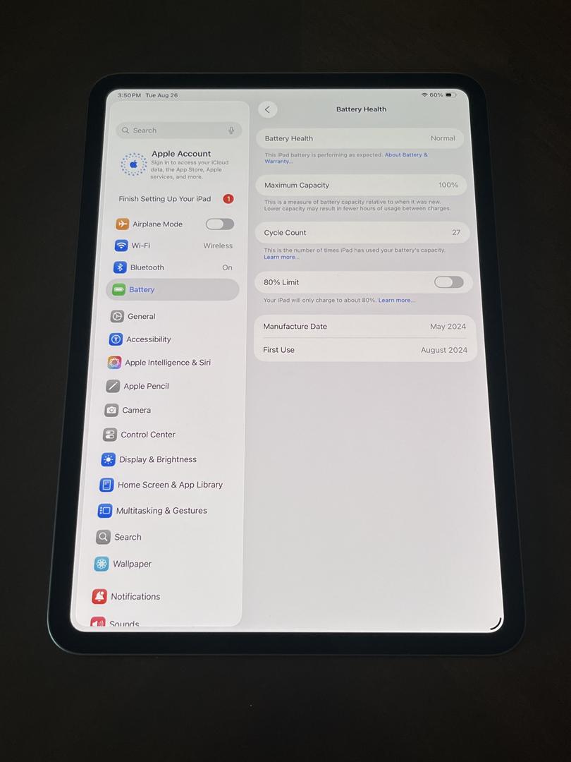 Battery health 100%, 27 battery cycles.